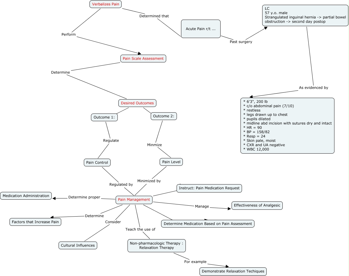 This Concept Map, created with IHMC CmapTools, has information related to: Acute Pain Pizzoferrato.cmap, LC 57 y.o. male Strangulated inguinal hernia -> partial bowel obstruction -> second day postop As evidenced by * 6'3", 200 lb * c/o abdominal pain (7/10) * restless * legs drawn up to chest * pupils dilated * midline abd incision with sutures dry and intact * HR = 90 * BP = 158/82 * Resp = 24 * Skin pale, moist * CXR and UA negative * WBC 12,000, Pain Management Manage Effectiveness of Analgesic, Pain Management Consider Cultural Influences, Pain Management Teach the use of Non-pharmacologic Therapy : Relaxation Therapy, Pain Management ???? Determine Medication Based on Pain Assessment, Outcome 1: Regulate Pain Control, Pain Scale Assessment Determine Desired Outcomes, Outcome 2: Minmize Pain Level, Pain Management ???? Instruct: Pain Medication Request, Acute Pain r/t ... Past surgery LC 57 y.o. male Strangulated inguinal hernia -> partial bowel obstruction -> second day postop, Pain Level Minimized by Pain Management, Pain Control Regulated by Pain Management, Pain Management Determine proper Medication Administration, Verbalizes Pain Determined that Acute Pain r/t ..., Pain Management Determine Factors that Increase Pain, Non-pharmacologic Therapy : Relaxation Therapy For example Demonstrate Relaxation Techiques, Desired Outcomes ???? Outcome 1:, Desired Outcomes ???? Outcome 2:, Verbalizes Pain Perform Pain Scale Assessment