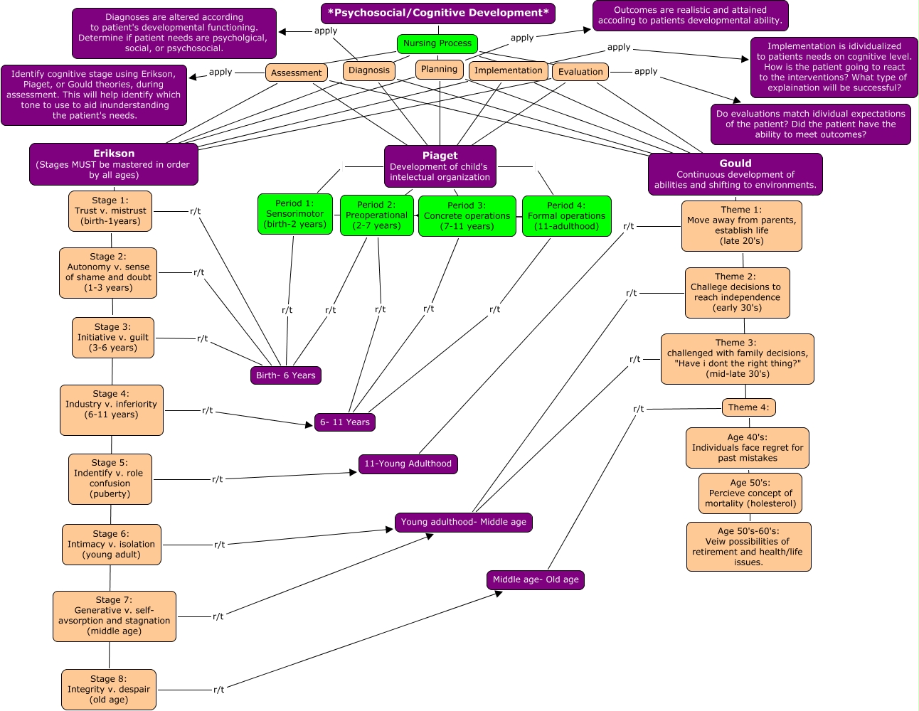This Concept Map, created with IHMC CmapTools, has information related to: DevelopmentaGodfrey, Diagnosis ???? Gould Continuous development of abilities and shifting to environments., Assessment ???? Piaget Development of child's intelectual organization, Gould Continuous development of abilities and shifting to environments. ???? Theme 1: Move away from parents, establish life (late 20's), Theme 3: challenged with family decisions, "Have i dont the right thing?" (mid-late 30's) r/t Young adulthood- Middle age, Period 2: Preoperational (2-7 years) r/t Birth- 6 Years, Implementation apply Implementation is idividualized to patients needs on cognitive level. How is the patient going to react to the interventions? What type of explaination will be successful?, Stage 6: Intimacy v. isolation (young adult) r/t Young adulthood- Middle age, Erikson (Stages MUST be mastered in order by all ages) ???? Stage 1: Trust v. mistrust (birth-1years), Theme 4: ???? Age 40's: Individuals face regret for past mistakes, Diagnosis ???? Erikson (Stages MUST be mastered in order by all ages), Nursing Process ???? Implementation, Diagnosis apply Diagnoses are altered according to patient's developmental functioning. Determine if patient needs are psycholgical, social, or psychosocial., Piaget Development of child's intelectual organization Period 4: Formal operations (11-adulthood), Theme 1: Move away from parents, establish life (late 20's) ???? Theme 4:, Stage 5: Indentify v. role confusion (puberty) r/t 11-Young Adulthood, Theme 1: Move away from parents, establish life (late 20's) r/t 11-Young Adulthood, Period 3: Concrete operations (7-11 years) r/t 6- 11 Years, Implementation ???? Piaget Development of child's intelectual organization, *Psychosocial/Cognitive Development* ???? Nursing Process, Assessment apply Identify cognitive stage using Erikson, Piaget, or Gould theories, during assessment. This will help identify which tone to use to aid inunderstanding the patient's needs.
