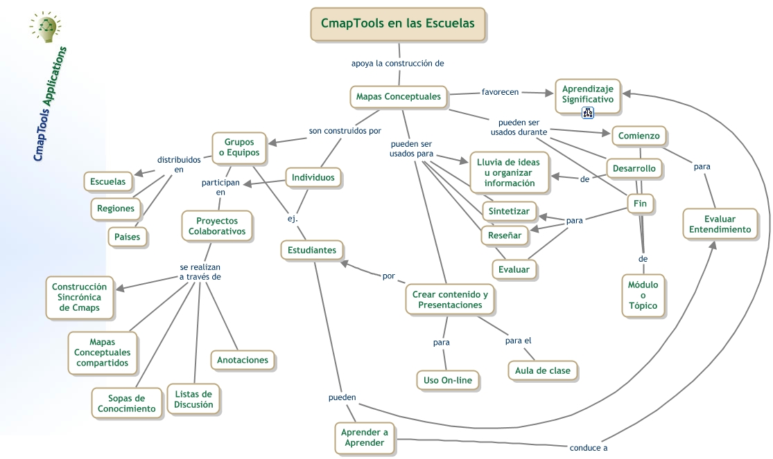 Este Cmap, tiene información relacionada con: cmaps, Mapas Conceptuales pueden ser usados para Reseñar, Fin de Módulo o Tópico, Aprender a Aprender conduce a Aprendizaje Significativo, Crear contenido y Presentaciones para el Aula de clase, Mapas Conceptuales son construidos por Grupos o Equipos, Mapas Conceptuales son construidos por Individuos, Estudiantes pueden Aprender a Aprender, Grupos o Equipos distribuidos en Regiones, Mapas Conceptuales pueden ser usados durante Desarrollo, Mapas Conceptuales pueden ser usados para Lluvia de ideas u organizar información, Comienzo para Evaluar Entendimiento, Grupos o Equipos distribuidos en Escuelas, Grupos o Equipos distribuidos en Países, Fin para Sintetizar, Desarrollo de Módulo o Tópico, Proyectos Colaborativos se realizan a través de Listas de Discusión, Proyectos Colaborativos se realizan a través de Sopas de Conocimiento, Individuos participan en Proyectos Colaborativos, Proyectos Colaborativos se realizan a través de Anotaciones, Individuos ej. Estudiantes