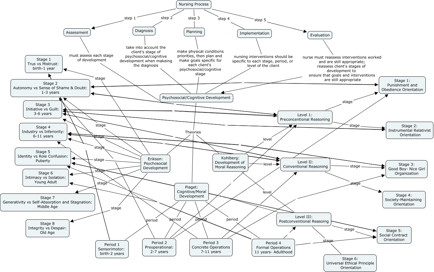 This Concept Map, created with IHMC CmapTools, has information related to: C. Van Sickle developmental cmap, Psychosocial/Cognitive Development Theories Kohlberg: Development of Moral Reasoning, Level II: Conventional Reasoning stage Stage 3: Good Boy- Nice Girl Organization, Psychosocial/Cognitive Development Theories Piaget: Cognitive/Moral Development, Kohlberg: Development of Moral Reasoning level Level III: Postconventional Reasoing, Level 1: Preconcentional Reasoning Stage 2 Autonomy vs Sense of Shame & Doubt: 1-3 years, Nursing Process step 5 Evaluation, Period 2 Preoperational: 2-7 years Stage 1: Punishment and Obedience Orientation, Psychosocial/Cognitive Development Theories Erikson: Psychosocial Development, Diagnosis take into account the client's stage of psychosocial/cognitive development when makeing the diagnosis Psychosocial/Cognitive Development, Nursing Process step 2 Diagnosis, Piaget: Cognitive/Moral Development period Period 4 Formal Operations 11 years- Adulthood, Stage 3: Good Boy- Nice Girl Organization Stage 4 Industry vs Inferiority: 6-11 years, Erikson: Psychosocial Development stage Stage 7 Generativity vs Self-Absorption and Stagnation: Middle Age, Planning make physical conditions priorities, then plan and make goals specific for each client's psychosocial/cognitive stage Psychosocial/Cognitive Development, Period 1 Sensorimotor: birth-2 years Stage 1 Trus vs Mistrust: birth-1 year, Nursing Process step 3 Planning, Level II: Conventional Reasoning stage Stage 4: Society-Maintaining Orientation, Piaget: Cognitive/Moral Development period Period 1 Sensorimotor: birth-2 years, Erikson: Psychosocial Development stage Stage 1 Trus vs Mistrust: birth-1 year, Level III: Postconventional Reasoing stage Stage 5: Social Contract Orientation