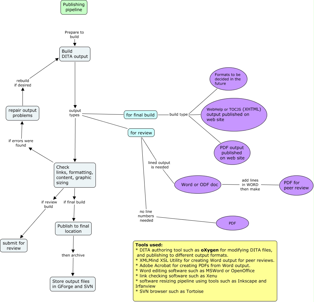 This Concept Map, created with IHMC CmapTools, has information related to: publishing pipeline, repair output problems rebuild if desired Build DITA output, Check links, formatting, content, graphic sizing if final build Publish to final location, Build DITA output output types Check links, formatting, content, graphic sizing, for review lined output is needed Word or ODF doc, for review no line numbers needed PDF, Check links, formatting, content, graphic sizing if errors were found repair output problems, Publish to final location then archive Store output files in GForge and SVN, Build DITA output output types for final build, Word or ODF doc add lines in WORD then make PDF for peer review, for final build build type WebHelp or TOCJS (XHTML) output published on web site, Check links, formatting, content, graphic sizing if review build submit for review, for final build build type Formats to be decided in the future, for final build build type PDF output published on web site, Publishing pipeline Prepare to build Build DITA output, Build DITA output output types for review