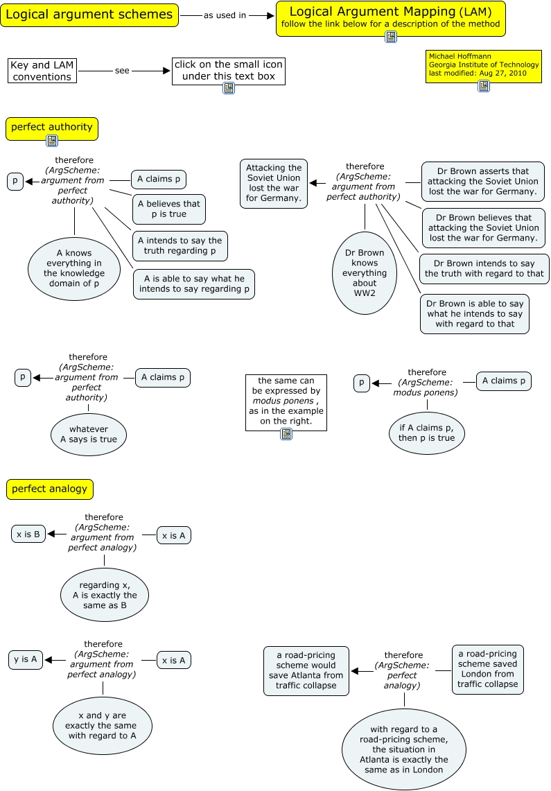 This Concept Map, created with IHMC CmapTools, has information related to: perfect authority and analogy, Dr Brown believes that attacking the Soviet Union lost the war for Germany. therefore (ArgScheme: argument from perfect authority) Attacking the Soviet Union lost the war for Germany., A claims p therefore (ArgScheme: argument from perfect authority) p, a road-pricing scheme saved London from traffic collapse therefore (ArgScheme: perfect analogy) a road-pricing scheme would save Atlanta from traffic collapse, if A claims p, then p is true therefore (ArgScheme: modus ponens) p, Key and LAM conventions see click on the small icon under this text box, x and y are exactly the same with regard to A therefore (ArgScheme: argument from perfect analogy) y is A, Dr Brown asserts that attacking the Soviet Union lost the war for Germany. therefore (ArgScheme: argument from perfect authority) Attacking the Soviet Union lost the war for Germany., x is A therefore (ArgScheme: argument from perfect analogy) y is A, Dr Brown is able to say what he intends to say with regard to that therefore (ArgScheme: argument from perfect authority) Attacking the Soviet Union lost the war for Germany., Dr Brown knows everything about WW2 therefore (ArgScheme: argument from perfect authority) Attacking the Soviet Union lost the war for Germany., regarding x, A is exactly the same as B therefore (ArgScheme: argument from perfect analogy) x is B, A intends to say the truth regarding p therefore (ArgScheme: argument from perfect authority) p, x is A therefore (ArgScheme: argument from perfect analogy) x is B, A knows everything in the knowledge domain of p therefore (ArgScheme: argument from perfect authority) p, whatever A says is true therefore (ArgScheme: argument from perfect authority) p, A is able to say what he intends to say regarding p therefore (ArgScheme: argument from perfect authority) p, A believes that p is true therefore (ArgScheme: argument from perfect authority) p, Logical argument schemes as used in Logical Argument Mapping (LAM) follow the link below for a description of the method, with regard to a road-pricing scheme, the situation in Atlanta is exactly the same as in London therefore (ArgScheme: perfect analogy) a road-pricing scheme would save Atlanta from traffic collapse, A claims p therefore (ArgScheme: argument from perfect authority) p