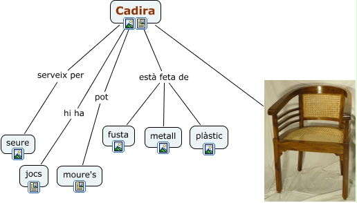 Aquest mapa conceptual conté informació relacionada amb: Cadira, Cadira pot moure's, Cadira, Cadira serveix per seure, Cadira està feta de metall, Cadira està feta de plàstic, Cadira hi ha jocs, Cadira està feta de fusta