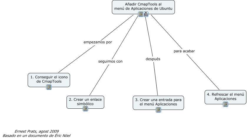Aquest mapa conceptual conté informació relacionada amb: CmapTools en menú Aplicaciones Linux, Añadir CmapTools al menú de Aplicaciones de Ubuntu empezamos por 1. Conseguir el icono de CmapTools, Añadir CmapTools al menú de Aplicaciones de Ubuntu para acabar 4. Refrescar el menú Aplicaciones, Añadir CmapTools al menú de Aplicaciones de Ubuntu seguimos con 2. Crear un enlace simbólico, Añadir CmapTools al menú de Aplicaciones de Ubuntu después 3. Crear una entrada para el menú Aplicaciones
