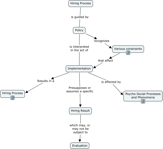 This Concept Map, created with IHMC CmapTools, has information related to: Hiring Process, Hiring Process is guided by Policy, Implementation Presupposes or assumes a specific Hiring Result, Implementation Results in a Hiring Process, Policy recognizes Various constraints, Various constraints that affect Implementation, Hiring Result which may, or may not be subject to Evaluation, Policy is interpreted in the act of Implementation, Implementation is affected by Psycho-Social Processes and Phenomena