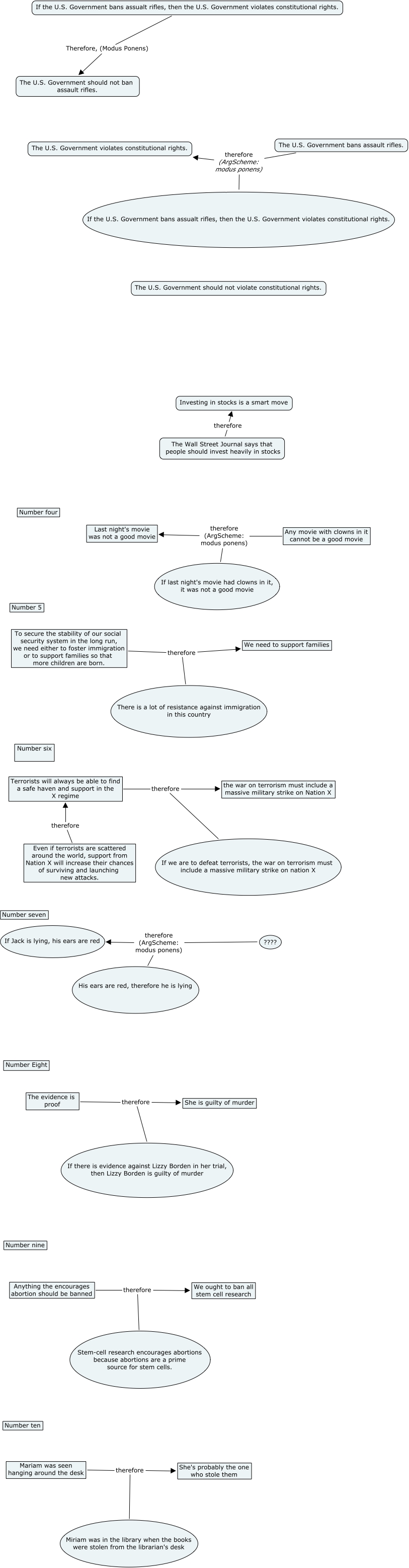 This Concept Map, created with IHMC CmapTools, has information related to: CMAP, ???? therefore (ArgScheme: modus ponens) If Jack is lying, his ears are red, Any movie with clowns in it cannot be a good movie therefore (ArgScheme: modus ponens) If last night's movie had clowns in it, it was not a good movie, The Wall Street Journal says that people should invest heavily in stocks therefore Investing in stocks is a smart move, Mariam was seen hanging around the desk therefore Miriam was in the library when the books were stolen from the librarian's desk, If the U.S. Government bans assualt rifles, then the U.S. Government violates constitutional rights. therefore (ArgScheme: modus ponens) The U.S. Government violates constitutional rights., Terrorists will always be able to find a safe haven and support in the X regime therefore If we are to defeat terrorists, the war on terrorism must include a massive military strike on nation X, Terrorists will always be able to find a safe haven and support in the X regime therefore the war on terrorism must include a massive military strike on Nation X, Mariam was seen hanging around the desk therefore She's probably the one who stole them, Even if terrorists are scattered around the world, support from Nation X will increase their chances of surviving and launching new attacks. therefore Terrorists will always be able to find a safe haven and support in the X regime, ???? therefore (ArgScheme: modus ponens) His ears are red, therefore he is lying, The evidence is proof therefore If there is evidence against Lizzy Borden in her trial, then Lizzy Borden is guilty of murder, The evidence is proof therefore She is guilty of murder, Anything the encourages abortion should be banned therefore We ought to ban all stem cell research, The U.S. Government bans assault rifles. therefore (ArgScheme: modus ponens) The U.S. Government violates constitutional rights., If the U.S. Government bans assualt rifles, then the U.S. Government violates constitutional rights. Therefore, (Modus Ponens) The U.S. Government should not ban assault rifles., To secure the stability of our social security system in the long run, we need either to foster immigration or to support families so that more children are born. therefore There is a lot of resistance against immigration in this country, To secure the stability of our social security system in the long run, we need either to foster immigration or to support families so that more children are born. therefore We need to support families, Any movie with clowns in it cannot be a good movie therefore (ArgScheme: modus ponens) Last night's movie was not a good movie, Anything the encourages abortion should be banned therefore Stem-cell research encourages abortions because abortions are a prime source for stem cells.