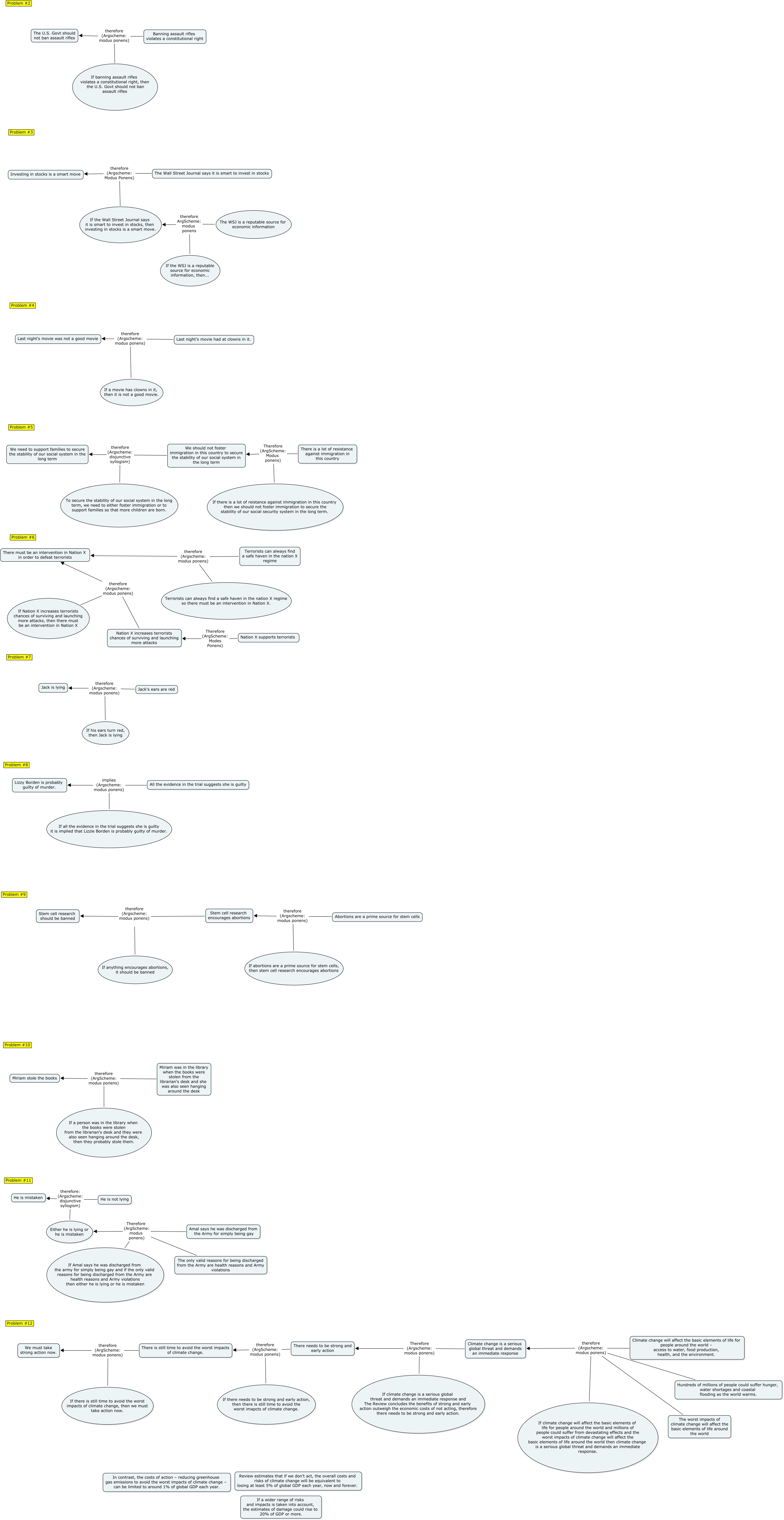 This Concept Map, created with IHMC CmapTools, has information related to: Marshall, Paige, Roma, Sahra, Emily, He is not lying therefore: (Argscheme: disjunctive syllogism) He is mistaken, If abortions are a prime source for stem cells, then stem cell research encourages abortions therefore (Argscheme: modus ponens) Stem cell research encourages abortions, The WSJ is a reputable source for economic information therefore ArgScheme: modus ponens If the Wall Street Journal says it is smart to invest in stocks, then investing in stocks is a smart move., If climate change will affect the basic elements of life for people around the world and millions of people could suffer from devastating effects and the worst impacts of climate change will affect the basic elements of life around the world then climate change is a serious global threat and demands an immediate response. therefore (Argscheme: modus ponens) Climate change is a serious global threat and demands an immediate response, If all the evidence in the trial suggests she is guilty it is implied that Lizzie Borden is probably guilty of murder. implies (Argscheme: modus ponens) Lizzy Borden is probably guilty of murder., If Amal says he was discharged from the army for simply being gay and if the only valid reasons for being discharged from the Army are health reasons and Army violations then either he is lying or he is mistaken Therefore (ArgScheme: modus ponens) Either he is lying or he is mistaken, Jack's ears are red therefore (Argscheme: modus ponens) Jack is lying, There is still time to avoid the worst impacts of climate change. therefore (ArgScheme: modus ponens) We must take strong action now., If there is a lot of reistance against immigration in this country then we should not foster immigration to secure the stability of our social security system in the long term. Therefore (ArgScheme: Modus ponens) We should not foster immigration in this country to secure the stability of our social system in the long term, Nation X increases terrorists chances of surviving and launching more attacks therefore (Argscheme: modus ponens) There must be an intervention in Nation X in order to defeat terrorists, If anything encourages abortions, it should be banned therefore (Argscheme: modus ponens) Stem cell research should be banned, If there is still time to avoid the worst impacts of climate change, then we must take action now. therefore (ArgScheme: modus ponens) We must take strong action now., There needs to be strong and early action therefore (ArgScheme: modus ponens) There is still time to avoid the worst impacts of climate change., Nation X supports terrorists Therefore (ArgScheme: Modes Ponens) Nation X increases terrorists chances of surviving and launching more attacks, The Wall Street Journal says it is smart to invest in stocks therefore (Argscheme: Modus Ponens) Investing in stocks is a smart move, Last night's movie had at clowns in it. therefore (Argscheme: modus ponens) Last night's movie was not a good movie, Banning assault rifles violates a constitutional right therefore (Argscheme: modus ponens) The U.S. Govt should not ban assault rifles, Amal says he was discharged from the Army for simply being gay Therefore (ArgScheme: modus ponens) Either he is lying or he is mistaken, Miriam was in the library when the books were stolen from the librarian's desk and she was also seen hanging around the desk therefore (ArgScheme: modus ponens) Miriam stole the books, Banning assault rifles violates a constitutional right therefore (Argscheme: modus ponens) If banning assault rifles violates a constitutional right, then the U.S. Govt should not ban assault rifles