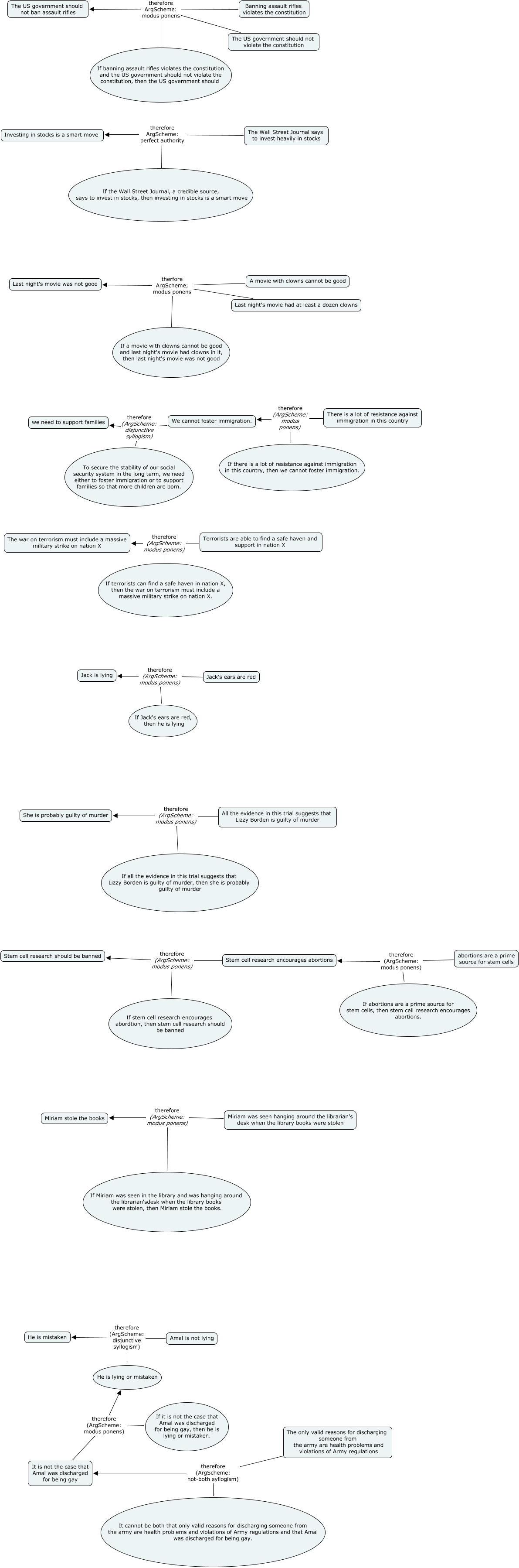 This Concept Map, created with IHMC CmapTools, has information related to: Chris, Stephanie, Eric, and Jourdyn, Last night's movie had at least a dozen clowns therfore ArgScheme; modus ponens If a movie with clowns cannot be good and last night's movie had clowns in it, then last night's movie was not good, We cannot foster immigration. therefore (ArgScheme: disjunctive syllogism) we need to support families, Stem cell research encourages abortions therefore (ArgScheme: modus ponens) Stem cell research should be banned, He is lying or mistaken therefore (ArgScheme: disjunctive syllogism) He is mistaken, If there is a lot of resistance against immigration in this country, then we cannot foster immigration. therefore (ArgScheme: modus ponens) We cannot foster immigration., Banning assault rifles violates the constitution therefore ArgScheme: modus ponens If banning assault rifles violates the constitution and the US government should not violate the constitution, then the US government should, All the evidence in this trial suggests that Lizzy Borden is guilty of murder therefore (ArgScheme: modus ponens) She is probably guilty of murder, The only valid reasons for discharging someone from the army are health problems and violations of Army regulations therefore (ArgScheme: not-both syllogism) It is not the case that Amal was discharged for being gay, If it is not the case that Amal was discharged for being gay, then he is lying or mistaken. therefore (ArgScheme: modus ponens) He is lying or mistaken, If terrorists can find a safe haven in nation X, then the war on terrorism must include a massive military strike on nation X. therefore (ArgScheme: modus ponens) The war on terrorism must include a massive military strike on nation X, If Miriam was seen in the library and was hanging around the librarian'sdesk when the library books were stolen, then Miriam stole the books. therefore (ArgScheme: modus ponens) Miriam stole the books, The Wall Street Journal says to invest heavily in stocks therefore ArgScheme: perfect authority Investing in stocks is a smart move, It is not the case that Amal was discharged for being gay therefore (ArgScheme: modus ponens) He is lying or mistaken, Terrorists are able to find a safe haven and support in nation X therefore (ArgScheme: modus ponens) The war on terrorism must include a massive military strike on nation X, Amal is not lying therefore (ArgScheme: disjunctive syllogism) He is mistaken, To secure the stability of our social security system in the long term, we need either to foster immigration or to support families so that more children are born. therefore (ArgScheme: disjunctive syllogism) we need to support families, It cannot be both that only valid reasons for discharging someone from the army are health problems and violations of Army regulations and that Amal was discharged for being gay. therefore (ArgScheme: not-both syllogism) It is not the case that Amal was discharged for being gay, If abortions are a prime source for stem cells, then stem cell research encourages abortions. therefore (ArgScheme: modus ponens) Stem cell research encourages abortions, Jack's ears are red therefore (ArgScheme: modus ponens) Jack is lying, There is a lot of resistance against immigration in this country therefore (ArgScheme: modus ponens) We cannot foster immigration.