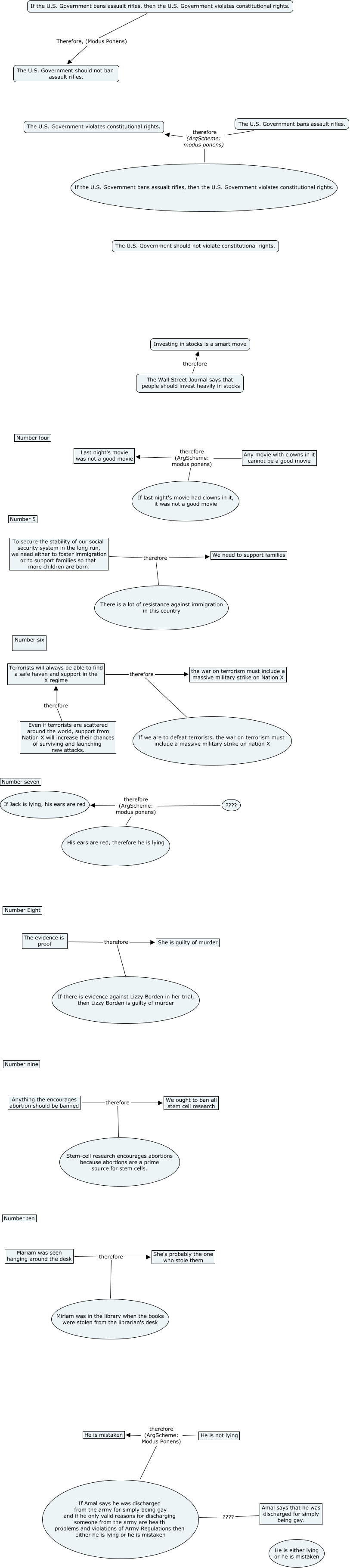 This Concept Map, created with IHMC CmapTools, has information related to: Kristen Byars, Laura Powell, Taylor Josey, Any movie with clowns in it cannot be a good movie therefore (ArgScheme: modus ponens) If last night's movie had clowns in it, it was not a good movie, The U.S. Government bans assault rifles. therefore (ArgScheme: modus ponens) The U.S. Government violates constitutional rights., To secure the stability of our social security system in the long run, we need either to foster immigration or to support families so that more children are born. therefore There is a lot of resistance against immigration in this country, The evidence is proof therefore She is guilty of murder, Amal says that he was discharged for simply being gay. ???? If Amal says he was discharged from the army for simply being gay and if he only valid reasons for discharging someone from the army are health problems and violations of Army Regulations then either he is lying or he is mistaken, If Amal says he was discharged from the army for simply being gay and if he only valid reasons for discharging someone from the army are health problems and violations of Army Regulations then either he is lying or he is mistaken therefore (ArgScheme: Modus Ponens) He is mistaken, Anything the encourages abortion should be banned therefore Stem-cell research encourages abortions because abortions are a prime source for stem cells., The evidence is proof therefore If there is evidence against Lizzy Borden in her trial, then Lizzy Borden is guilty of murder, ???? therefore (ArgScheme: modus ponens) If Jack is lying, his ears are red, Terrorists will always be able to find a safe haven and support in the X regime therefore the war on terrorism must include a massive military strike on Nation X, Terrorists will always be able to find a safe haven and support in the X regime therefore If we are to defeat terrorists, the war on terrorism must include a massive military strike on nation X, He is not lying therefore (ArgScheme: Modus Ponens) He is mistaken, Even if terrorists are scattered around the world, support from Nation X will increase their chances of surviving and launching new attacks. therefore Terrorists will always be able to find a safe haven and support in the X regime, To secure the stability of our social security system in the long run, we need either to foster immigration or to support families so that more children are born. therefore We need to support families, If the U.S. Government bans assualt rifles, then the U.S. Government violates constitutional rights. Therefore, (Modus Ponens) The U.S. Government should not ban assault rifles., Anything the encourages abortion should be banned therefore We ought to ban all stem cell research, The Wall Street Journal says that people should invest heavily in stocks therefore Investing in stocks is a smart move, ???? therefore (ArgScheme: modus ponens) His ears are red, therefore he is lying, If the U.S. Government bans assualt rifles, then the U.S. Government violates constitutional rights. therefore (ArgScheme: modus ponens) The U.S. Government violates constitutional rights., Mariam was seen hanging around the desk therefore She's probably the one who stole them