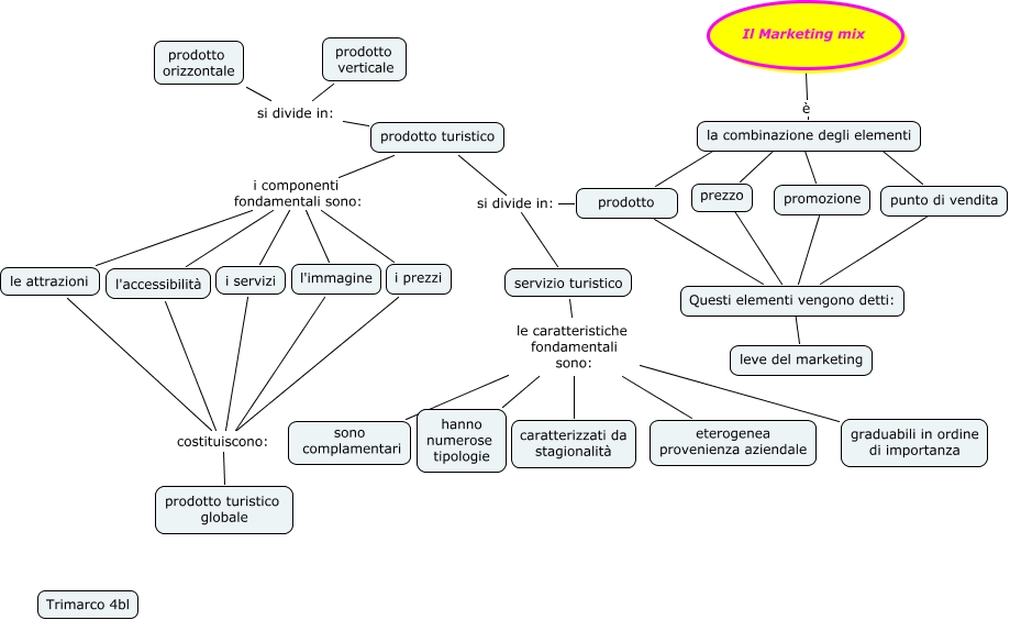 Questa Cmap, creata con IHMC CmapTools, contiene informazioni relative a: mark-tur1-Trimarco4bl, prodotto turistico i componenti fondamentali sono: l'accessibilità, punto di vendita ???? Questi elementi vengono detti:, prodotto turistico si divide in: prodotto verticale, prodotto turistico i componenti fondamentali sono: l'immagine, i prezzi costituiscono: prodotto turistico globale, prezzo ???? Questi elementi vengono detti:, servizio turistico le caratteristiche fondamentali sono: graduabili in ordine di importanza, prodotto turistico si divide in: prodotto orizzontale, Questi elementi vengono detti: ???? leve del marketing, l'accessibilità costituiscono: prodotto turistico globale, prodotto ???? Questi elementi vengono detti:, i servizi costituiscono: prodotto turistico globale, la combinazione degli elementi ???? punto di vendita, Il Marketing mix è la combinazione degli elementi, servizio turistico le caratteristiche fondamentali sono: sono complamentari, la combinazione degli elementi ???? prezzo, prodotto si divide in: servizio turistico, la combinazione degli elementi ???? promozione, servizio turistico le caratteristiche fondamentali sono: hanno numerose tipologie, l'immagine costituiscono: prodotto turistico globale