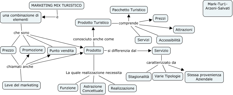 Questa Cmap, creata con IHMC CmapTools, contiene informazioni relative a: Arzeni Salvati marketing turistico1, Prodotto Turistico comprende Attrazioni, una combinazione di elementi che sono Prezzo, Prodotto Turistico comprende Prezzi, Servizio caratterizzato da Stagionalità, Prodotto La quale realizzazione necessita Funzione, una combinazione di elementi che sono Promozione, Servizio caratterizzato da Varie Tipologie, Prezzo chiamati anche Prodotto, Servizio caratterizzato da Stessa provenienza Aziendale, Prodotto conosciuto anche come Prodotto Turistico, una combinazione di elementi che sono Prodotto, Prodotto si differenzia dal Servizio, una combinazione di elementi che sono Punto vendita, MARKETING MIX TURISTICO è una combinazione di elementi, Prezzo chiamati anche Punto vendita, Prodotto Turistico comprende Accessibilità, Prodotto Turistico comprende Servizi, Prodotto Turistico comprende Pacchetto Turistico, Prezzo chiamati anche Leve del marketing, Prodotto La quale realizzazione necessita Realizzazione