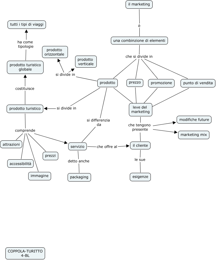 Questa Cmap, creata con IHMC CmapTools, contiene informazioni relative a: MARKETING MIX TURISTICO COPPOLA-TURITTO 4BL, punto di vendita ???? leve del marketing, prodotto turistico costituisce prodotto turistico globale, prodotto turistico comprende immagine, prodotto si divide in prodotto orizzontale, leve del marketing che tengono presente marketing mix, servizio che offre al il cliente, una combinzione di elementi che si divide in punto di vendita, prodotto ???? leve del marketing, una combinzione di elementi che si divide in prodotto, prodotto si divide in prodotto verticale, prodotto ???? leve del marketing, prodotto turistico globale ha come tipologie tutti i tipi di viaggi, una combinzione di elementi che si divide in prezzo, promozione ???? leve del marketing, leve del marketing che tengono presente modifiche future, una combinzione di elementi che si divide in promozione, prodotto turistico comprende attrazioni, prodotto turistico comprende accessibilità, il marketing è una combinzione di elementi, leve del marketing che tengono presente il cliente