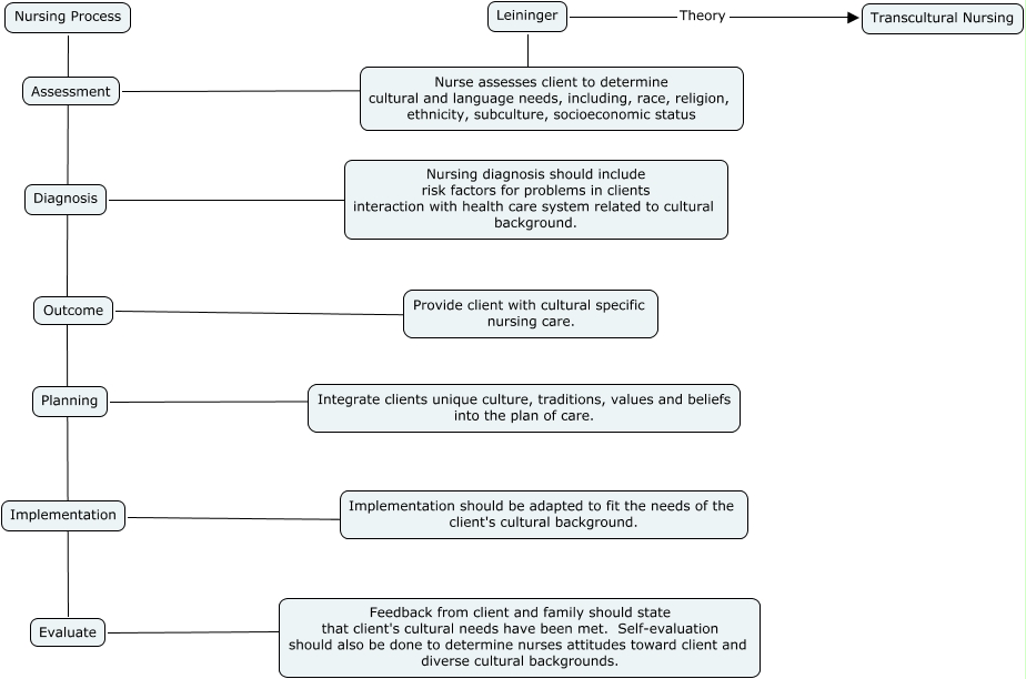 This Concept Map, created with IHMC CmapTools, has information related to: Barney, nursing theory, Leininger ???? Nurse assesses client to determine cultural and language needs, including, race, religion, ethnicity, subculture, socioeconomic status, Outcome ???? Provide client with cultural specific nursing care., Assessment ???? Nurse assesses client to determine cultural and language needs, including, race, religion, ethnicity, subculture, socioeconomic status, Nursing Process ???? Evaluate, Leininger Theory Transcultural Nursing, Diagnosis ???? Nursing diagnosis should include risk factors for problems in clients interaction with health care system related to cultural background., Planning ???? Integrate clients unique culture, traditions, values and beliefs into the plan of care., Implementation ???? Implementation should be adapted to fit the needs of the client's cultural background., Evaluate ???? Feedback from client and family should state that client's cultural needs have been met. Self-evaluation should also be done to determine nurses attitudes toward client and diverse cultural backgrounds.