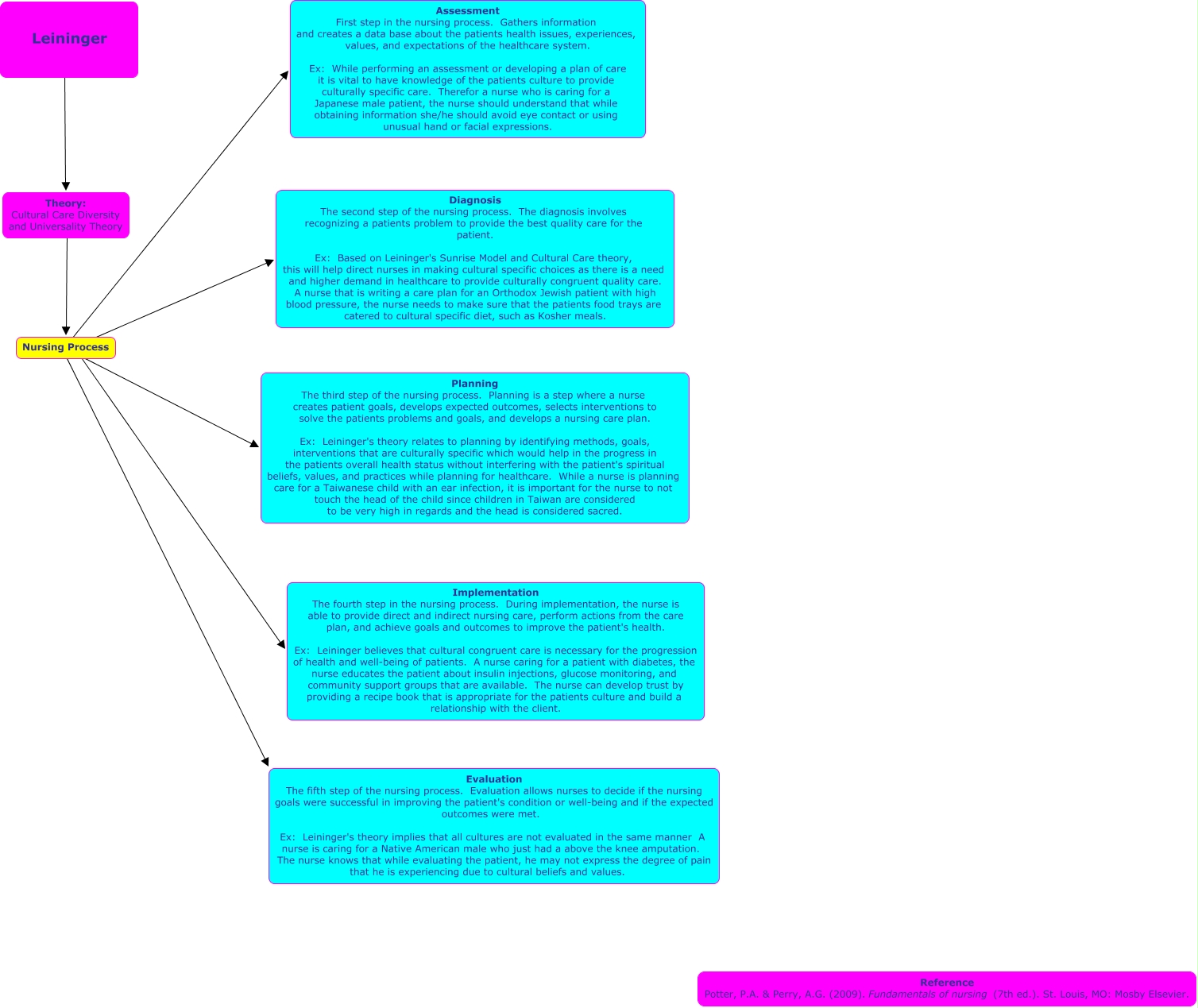 This Concept Map, created with IHMC CmapTools, has information related to: Extra Credit Theory CMap, Theory: Cultural Care Diversity and Universality Theory ???? Nursing Process, Nursing Process ???? Evaluation The fifth step of the nursing process. Evaluation allows nurses to decide if the nursing goals were successful in improving the patient's condition or well-being and if the expected outcomes were met. Ex: Leininger's theory implies that all cultures are not evaluated in the same manner A nurse is caring for a Native American male who just had a above the knee amputation. The nurse knows that while evaluating the patient, he may not express the degree of pain that he is experiencing due to cultural beliefs and values., Nursing Process ???? Planning The third step of the nursing process. Planning is a step where a nurse creates patient goals, develops expected outcomes, selects interventions to solve the patients problems and goals, and develops a nursing care plan. Ex: Leininger's theory relates to planning by identifying methods, goals, interventions that are culturally specific which would help in the progress in the patients overall health status without interfering with the patient's spiritual beliefs, values, and practices while planning for healthcare. While a nurse is planning care for a Taiwanese child with an ear infection, it is important for the nurse to not touch the head of the child since children in Taiwan are considered to be very high in regards and the head is considered sacred., Nursing Process ???? Implementation The fourth step in the nursing process. During implementation, the nurse is able to provide direct and indirect nursing care, perform actions from the care plan, and achieve goals and outcomes to improve the patient's health. Ex: Leininger believes that cultural congruent care is necessary for the progression of health and well-being of patients. A nurse caring for a patient with diabetes, the nurse educates the patient about insulin injections, glucose monitoring, and community support groups that are available. The nurse can develop trust by providing a recipe book that is appropriate for the patients culture and build a relationship with the client., Nursing Process ???? Diagnosis The second step of the nursing process. The diagnosis involves recognizing a patients problem to provide the best quality care for the patient. Ex: Based on Leininger's Sunrise Model and Cultural Care theory, this will help direct nurses in making cultural specific choices as there is a need and higher demand in healthcare to provide culturally congruent quality care. A nurse that is writing a care plan for an Orthodox Jewish patient with high blood pressure, the nurse needs to make sure that the patients food trays are catered to cultural specific diet, such as Kosher meals., Nursing Process ???? Assessment First step in the nursing process. Gathers information and creates a data base about the patients health issues, experiences, values, and expectations of the healthcare system. Ex: While performing an assessment or developing a plan of care it is vital to have knowledge of the patients culture to provide culturally specific care. Therefor a nurse who is caring for a Japanese male patient, the nurse should understand that while obtaining information she/he should avoid eye contact or using unusual hand or facial expressions., Leininger ???? Theory: Cultural Care Diversity and Universality Theory