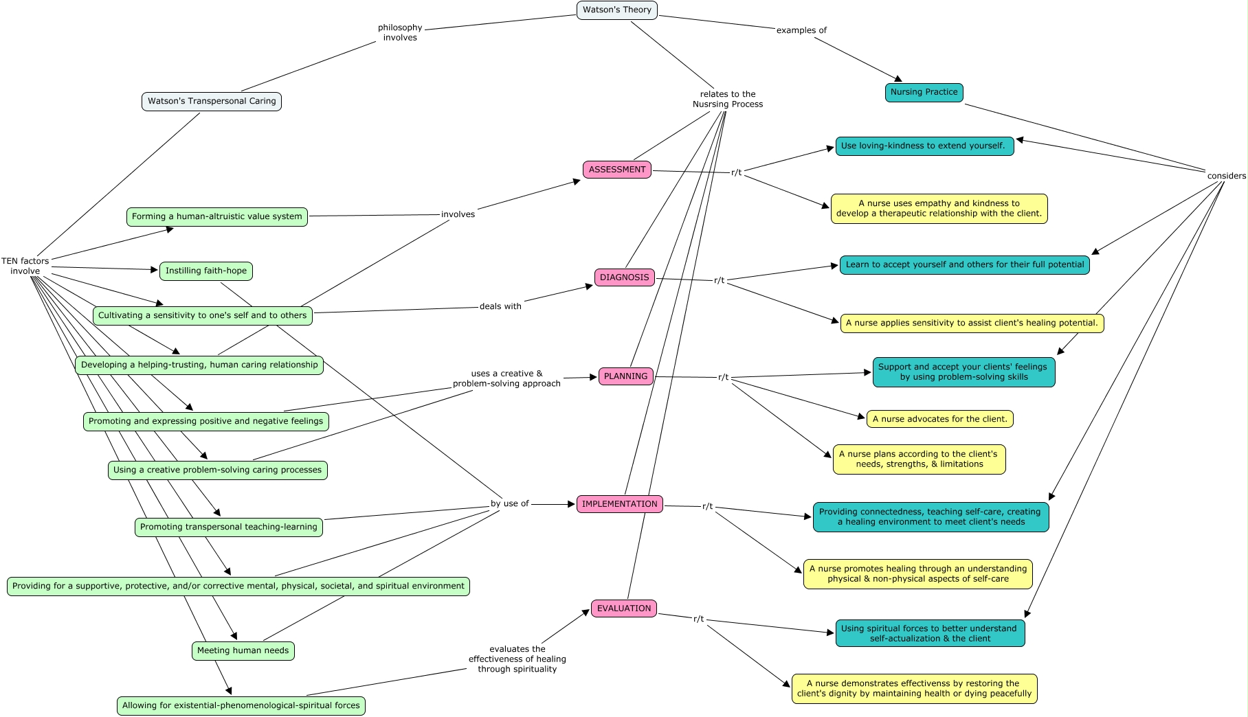 This Concept Map, created with IHMC CmapTools, has information related to: Busch.Duong.WatsonTheory, Developing a helping-trusting, human caring relationship involves ASSESSMENT, PLANNING r/t Support and accept your clients' feelings by using problem-solving skills, Instilling faith-hope by use of IMPLEMENTATION, Nursing Practice considers Providing connectedness, teaching self-care, creating a healing environment to meet client's needs, Allowing for existential-phenomenological-spiritual forces evaluates the effectiveness of healing through spirituality EVALUATION, Meeting human needs by use of IMPLEMENTATION, Watson's Transpersonal Caring TEN factors involve Forming a human-altruistic value system, Using a creative problem-solving caring processes uses a creative & problem-solving approach PLANNING, PLANNING r/t A nurse plans according to the client's needs, strengths, & limitations, IMPLEMENTATION r/t A nurse promotes healing through an understanding physical & non-physical aspects of self-care, EVALUATION r/t Using spiritual forces to better understand self-actualization & the client, Watson's Transpersonal Caring TEN factors involve Promoting and expressing positive and negative feelings, EVALUATION r/t A nurse demonstrates effectivenss by restoring the client's dignity by maintaining health or dying peacefully, Watson's Transpersonal Caring TEN factors involve Providing for a supportive, protective, and/or corrective mental, physical, societal, and spiritual environment, PLANNING r/t A nurse advocates for the client., Watson's Transpersonal Caring TEN factors involve Cultivating a sensitivity to one's self and to others, Nursing Practice considers Use loving-kindness to extend yourself., Watson's Transpersonal Caring TEN factors involve Using a creative problem-solving caring processes, Watson's Transpersonal Caring TEN factors involve Promoting transpersonal teaching-learning, Nursing Practice considers Support and accept your clients' feelings by using problem-solving skills