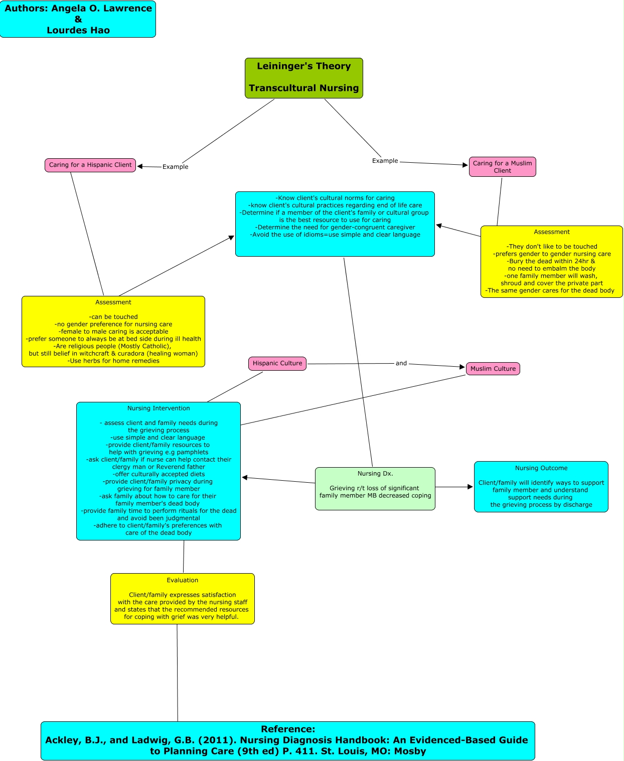 This Concept Map, created with IHMC CmapTools, has information related to: NURSING THEORIST-LEININGER'S THEORY, Caring for a Muslim Client ???? Assessment -They don't like to be touched -prefers gender to gender nursing care -Bury the dead within 24hr & no need to embalm the body -one family member will wash, shroud and cover the private part -The same gender cares for the dead body, Assessment -can be touched -no gender preference for nursing care -female to male caring is acceptable -prefer someone to always be at bed side during ill health -Are religious people (Mostly Catholic), but still belief in witchcraft & curadora (healing woman) -Use herbs for home remedies ???? ????, Leininger's Theory Transcultural Nursing Example Caring for a Muslim Client, Muslim Culture ???? Nursing Intervention - assess client and family needs during the grieving process -use simple and clear language -provide client/family resources to help with grieving e.g pamphlets -ask client/family if nurse can help contact their clergy man or Reverend father -offer culturally accepted diets -provide client/family privacy during grieving for family member -ask family about how to care for their family member's dead body -provide family time to perform rituals for the dead and avoid been judgmental -adhere to client/family's preferences with care of the dead body, Hispanic Culture and Muslim Culture, Assessment -They don't like to be touched -prefers gender to gender nursing care -Bury the dead within 24hr & no need to embalm the body -one family member will wash, shroud and cover the private part -The same gender cares for the dead body ???? -Know client's cultural norms for caring -know client's cultural practices regarding end of life care -Determine if a member of the client's family or cultural group is the best resource to use for caring -Determine the need for gender-congruent caregiver -Avoid the use of idioms=use simple and clear language, Caring for a Hispanic Client ???? Assessment -can be touched -no gender preference for nursing care -female to male caring is acceptable -prefer someone to always be at bed side during ill health -Are religious people (Mostly Catholic), but still belief in witchcraft & curadora (healing woman) -Use herbs for home remedies, -Know client's cultural norms for caring -know client's cultural practices regarding end of life care -Determine if a member of the client's family or cultural group is the best resource to use for caring -Determine the need for gender-congruent caregiver -Avoid the use of idioms=use simple and clear language ???? Nursing Dx. Grieving r/t loss of significant family member MB decreased coping, Nursing Dx. Grieving r/t loss of significant family member MB decreased coping ???? Nursing Outcome Client/family will identify ways to support family member and understand support needs during the grieving process by discharge, Hispanic Culture ???? Nursing Intervention - assess client and family needs during the grieving process -use simple and clear language -provide client/family resources to help with grieving e.g pamphlets -ask client/family if nurse can help contact their clergy man or Reverend father -offer culturally accepted diets -provide client/family privacy during grieving for family member -ask family about how to care for their family member's dead body -provide family time to perform rituals for the dead and avoid been judgmental -adhere to client/family's preferences with care of the dead body, Leininger's Theory Transcultural Nursing Example Caring for a Hispanic Client, Nursing Dx. Grieving r/t loss of significant family member MB decreased coping ???? Nursing Intervention - assess client and family needs during the grieving process -use simple and clear language -provide client/family resources to help with grieving e.g pamphlets -ask client/family if nurse can help contact their clergy man or Reverend father -offer culturally accepted diets -provide client/family privacy during grieving for family member -ask family about how to care for their family member's dead body -provide family time to perform rituals for the dead and avoid been judgmental -adhere to client/family's preferences with care of the dead body, Nursing Intervention - assess client and family needs during the grieving process -use simple and clear language -provide client/family resources to help with grieving e.g pamphlets -ask client/family if nurse can help contact their clergy man or Reverend father -offer culturally accepted diets -provide client/family privacy during grieving for family member -ask family about how to care for their family member's dead body -provide family time to perform rituals for the dead and avoid been judgmental -adhere to client/family's preferences with care of the dead body ???? Evaluation Client/family expresses satisfaction with the care provided by the nursing staff and states that the recommended resources for coping with grief was very helpful., Evaluation Client/family expresses satisfaction with the care provided by the nursing staff and states that the recommended resources for coping with grief was very helpful. ???? ????