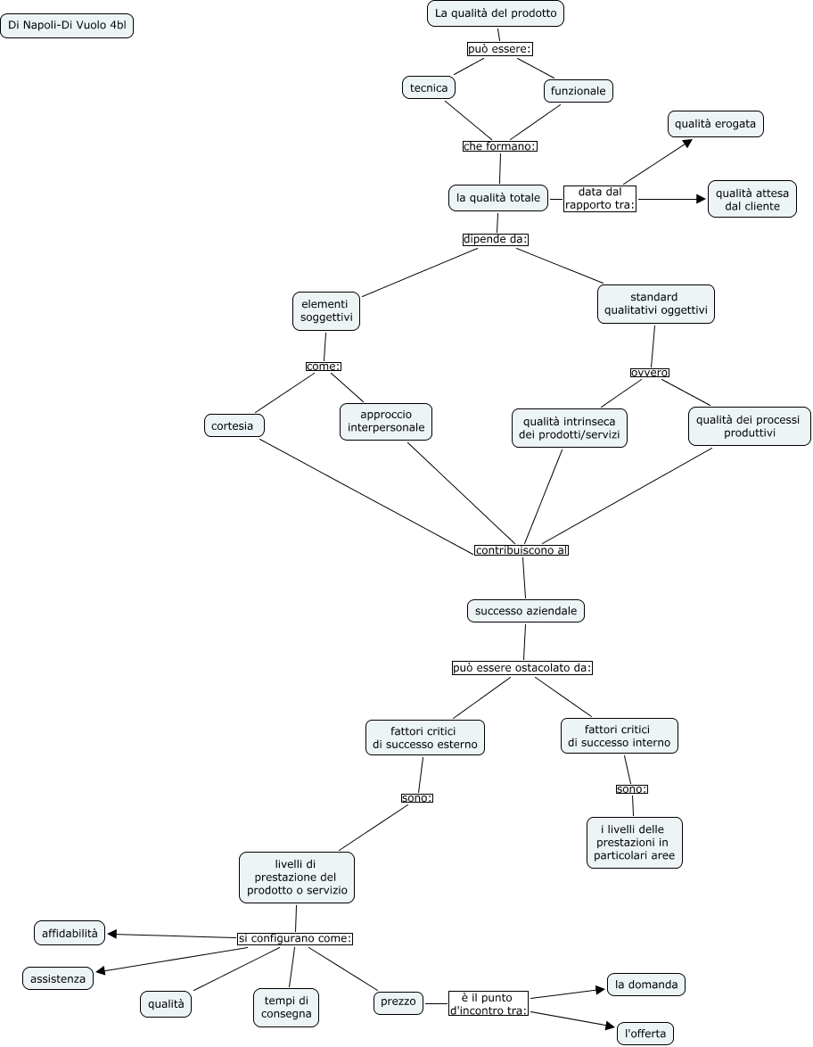 Questa Cmap, creata con IHMC CmapTools, contiene informazioni relative a: La Qualità Del Prodotto di Napoli Di Vuolo, La qualità del prodotto può essere: tecnica, approccio interpersonale contribuiscono al successo aziendale, elementi soggettivi come: approccio interpersonale, livelli di prestazione del prodotto o servizio si configurano come: assistenza, fattori critici di successo interno sono: i livelli delle prestazioni in particolari aree, elementi soggettivi come: cortesia, livelli di prestazione del prodotto o servizio si configurano come: qualità, standard qualitativi oggettivi ovvero qualità dei processi produttivi, successo aziendale può essere ostacolato da: fattori critici di successo interno, la qualità totale dipende da: elementi soggettivi, prezzo è il punto d'incontro tra: la domanda, successo aziendale può essere ostacolato da: fattori critici di successo esterno, livelli di prestazione del prodotto o servizio si configurano come: tempi di consegna, la qualità totale data dal rapporto tra: qualità erogata, standard qualitativi oggettivi ovvero qualità intrinseca dei prodotti/servizi, fattori critici di successo esterno sono: livelli di prestazione del prodotto o servizio, La qualità del prodotto può essere: funzionale, la qualità totale data dal rapporto tra: qualità attesa dal cliente, prezzo è il punto d'incontro tra: l'offerta, la qualità totale dipende da: standard qualitativi oggettivi