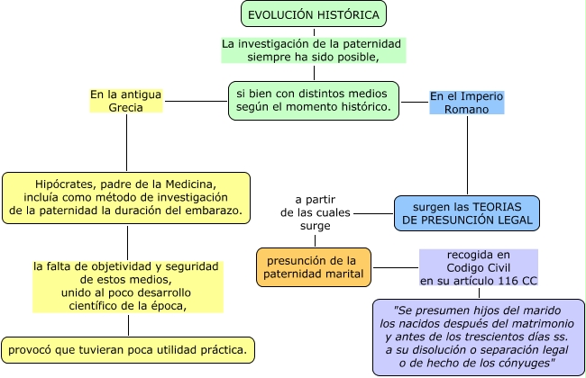 Este Cmap, tiene información relacionada con: negativa_pp3, Hipócrates, padre de la Medicina, incluía como método de investigación de la paternidad la duración del embarazo. la falta de objetividad y seguridad de estos medios, unido al poco desarrollo científico de la época, provocó que tuvieran poca utilidad práctica., EVOLUCIÓN HISTÓRICA La investigación de la paternidad siempre ha sido posible, si bien con distintos medios según el momento histórico., si bien con distintos medios según el momento histórico. En la antigua Grecia Hipócrates, padre de la Medicina, incluía como método de investigación de la paternidad la duración del embarazo., si bien con distintos medios según el momento histórico. En el Imperio Romano surgen las TEORIAS DE PRESUNCIÓN LEGAL, presunción de la paternidad marital recogida en Codigo Civil en su artículo 116 CC "Se presumen hijos del marido los nacidos después del matrimonio y antes de los trescientos días ss. a su disolución o separación legal o de hecho de los cónyuges", surgen las TEORIAS DE PRESUNCIÓN LEGAL a partir de las cuales surge presunción de la paternidad marital