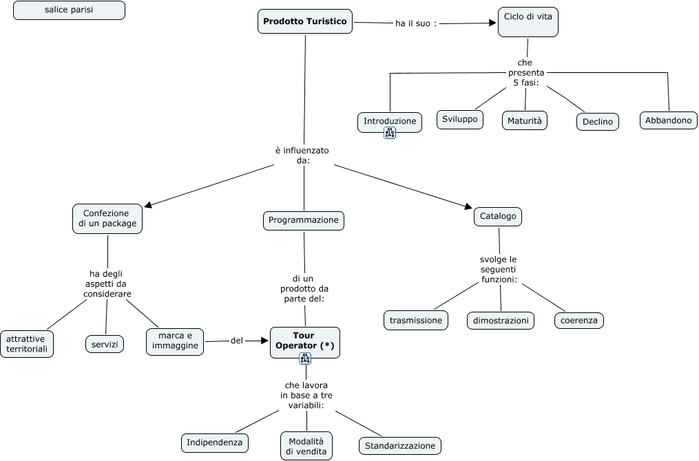 Questa Cmap, creata con IHMC CmapTools, contiene informazioni relative a: prodotto turistico salice parisi 4bl, Ciclo di vita che presenta 5 fasi: Sviluppo, Catalogo svolge le seguenti funzioni: dimostrazioni, Tour Operator (*) che lavora in base a tre variabili: Standarizzazione, Ciclo di vita che presenta 5 fasi: Introduzione, Prodotto Turistico è influenzato da: Confezione di un package, Ciclo di vita che presenta 5 fasi: Maturità, Catalogo svolge le seguenti funzioni: coerenza, Ciclo di vita che presenta 5 fasi: Abbandono, Prodotto Turistico ha il suo : Ciclo di vita, Confezione di un package ha degli aspetti da considerare attrattive territoriali, marca e immaggine del Tour Operator (*), Confezione di un package ha degli aspetti da considerare marca e immaggine, Confezione di un package ha degli aspetti da considerare servizi, Tour Operator (*) che lavora in base a tre variabili: Modalità di vendita, Tour Operator (*) che lavora in base a tre variabili: Indipendenza, Catalogo svolge le seguenti funzioni: trasmissione, Prodotto Turistico è influenzato da: Programmazione, Programmazione di un prodotto da parte del: Tour Operator (*), Ciclo di vita che presenta 5 fasi: Declino, Prodotto Turistico è influenzato da: Catalogo