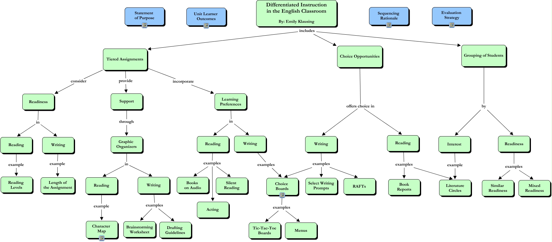This Concept Map, created with IHMC CmapTools, has information related to: Klausing - EDTL 7100 - Differentiated Instruction in the English Classroom-1.cmap, Choice Opportunities offers choice in Reading, Tiered Assignments consider Readiness, Grouping of Students by Readiness, Reading example Reading Levels, Reading examples Books on Audio, Tiered Assignments provide Support, Writing examples Brainstorming Worksheet, Reading examples Acting, Writing examples Select Writing Prompts, Graphic Organizers in Reading, Reading examples Literature Circles, Writing examples RAFTs, Readiness examples Similar Readiness, Support through Graphic Organizers, Learning Preferences in Reading, Writing example Length of the Assignment, Reading examples Book Reports, Choice Opportunities offers choice in Writing, Learning Preferences in Writing, Readiness in Writing