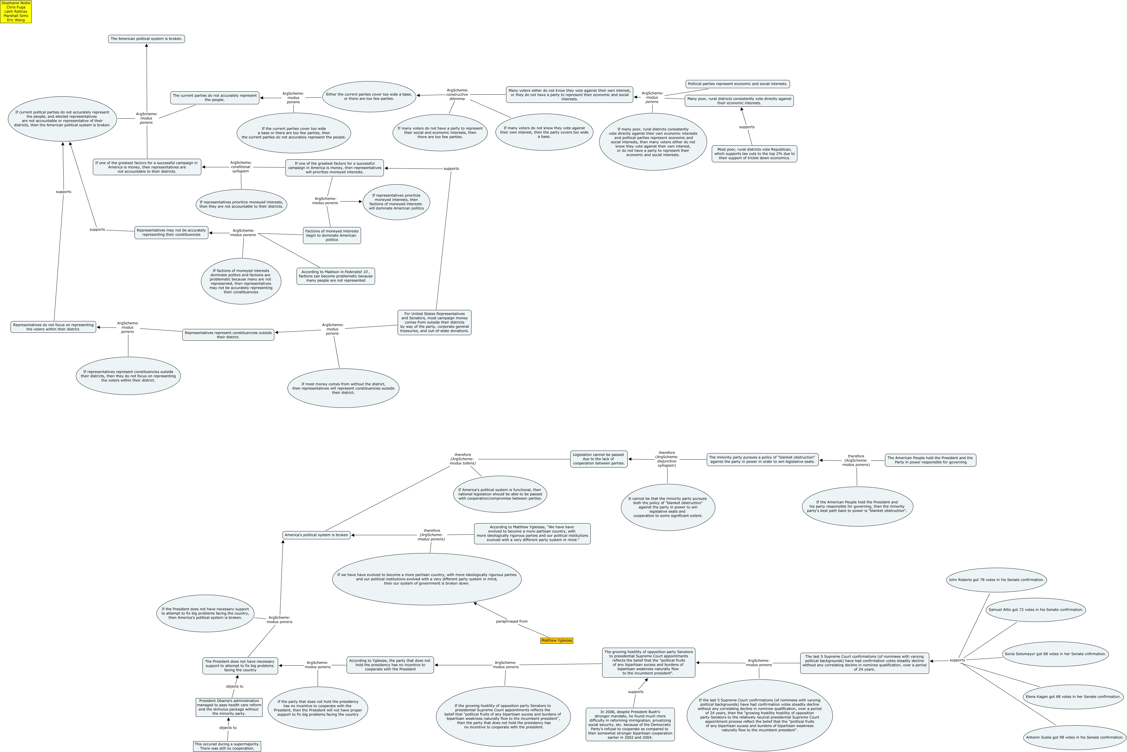 This Concept Map, created with IHMC CmapTools, has information related to: 9-G, It cannot be that the minority party pursues both the policy of "blanket obstruction" against the party in power to win legislative seats and cooperation to some significant extent. therefore (ArgScheme: disjunctive syllogism) Legislation cannot be passed due to the lack of cooperation between parties., Representatives may not be accurately representing their constituencies supports If current politcal parties do not accurately represent the people, and elected representatives are not accountable or representative of their districts, then the American political system is broken., The American People hold the President and the Party in power responsible for governing therefore (ArgScheme: modus ponens) The minority party pursues a policy of "blanket obstruction" against the party in power in order to win legislative seats., If one of the greatest factors for a successful campaign in America is money, then representatives will prioritize moneyed interests. ArgScheme: conditional syllogism If representatives prioritize moneyed interests, then they are not accountable to their districts., If current politcal parties do not accurately represent the people, and elected representatives are not accountable or representative of their districts, then the American political system is broken. ArgScheme: modus ponens The American political system is broken., If one of the greatest factors for a successful campaign in America is money, then representatives will prioritize moneyed interests. ArgScheme: modus ponens Factions of moneyed interests begin to dominate American politics, For United States Representatives and Senators, most campaign money comes from outside their districts by way of the party, corporate general treasuries, and out-of-state donations. ArgScheme: modus ponens If most money comes from without the district, then representatives will represent constituencies outside their district., Representatives represent constituencies outside their district. ArgScheme: modus ponens Representatives do not focus on representing the voters within their district., Many poor, rural districts consistently vote directly against their economic interests. ArgScheme: modus ponens If many poor, rural districts consistently vote directly against their own economic interests and political parties represent economic and social interests, then many voters either do not know they vote against their own interest, or do not have a party to represent their economic and social interests., Political parties represent economic and social interests. ArgScheme: modus ponens Many voters either do not know they vote against their own interest, or they do not have a party to represent their economic and social interests., Legislation cannot be passed due to the lack of cooperation between parties. therefore (ArgScheme: modus tollens) America's political system is broken, Factions of moneyed interests begin to dominate American politics ArgScheme: modus ponens Representatives may not be accurately representing their constituencies, John Roberts got 78 votes in his Senate confirmation. supports The last 5 Supreme Court confirmations (of nominees with varying political backgrounds) have had confirmation votes steadily decline without any correlating decline in nominee qualification, over a period of 24 years., Factions of moneyed interests begin to dominate American politics ArgScheme: modus ponens If factions of moneyed interests dominate politics and factions are problematic because many are not represented, then representatives may not be accurately representing their constituencies, Antonin Scalia got 98 votes in his Senate confirmation. supports The last 5 Supreme Court confirmations (of nominees with varying political backgrounds) have had confirmation votes steadily decline without any correlating decline in nominee qualification, over a period of 24 years., The current parties do not accurately represent the people. ArgScheme: modus ponens The American political system is broken., According to Matthew Ygleisias, "We have have evolved to become a more partisan country, with more ideologically rigorous parties and our political institutions evolved with a very different party system in mind." therefore (ArgScheme: modus ponens) America's political system is broken, According to Yglesias, the party that does not hold the presidency has no incentive to cooperate with the President ArgScheme: modus ponens The President does not have necessary support to attempt to fix big problems facing the country, For United States Representatives and Senators, most campaign money comes from outside their districts by way of the party, corporate general treasuries, and out-of-state donations. supports If one of the greatest factors for a successful campaign in America is money, then representatives will prioritize moneyed interests., According to Madison in Federalist 10, factions can become problematic because many people are not represented ArgScheme: modus ponens If factions of moneyed interests dominate politics and factions are problematic because many are not represented, then representatives may not be accurately representing their constituencies