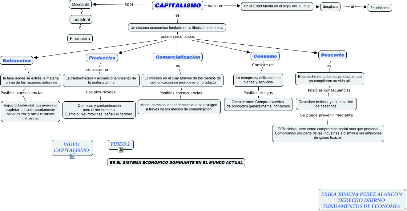 Este Cmap, tiene información relacionada con: MAPA CONCEPTUAL CAPITALISMO ERIKA PEREZ DERECHO DIURNO, Consumo Consiste en La compra dy utilizacion de bienes y servicios, CAPITALISMO nacio en En la Edad Media en el siglo XIII. El cual, Un sistema economico fundado en la libertad economica posee cinco etapas Comercializacion, Un sistema economico fundado en la libertad economica posee cinco etapas Consumo, En la Edad Media en el siglo XIII. El cual ???? desplazo, Comercializacion es El proceso en el cual atraves de los medios de comunicacion se promueve un producto, Un sistema economico fundado en la libertad economica posee cinco etapas Produccion, la fase donde se extrae la materia prima de los recursos naturales Posibles consecuencias Impacto Ambiental: que genera al explotar indiscrimanadamente bosques, rios y otros recursos natrurales, Mercantil y Industrial, La trasformacion y acondicionammiento de la materia prima Posibles riesgos Quimicos y contaminacion para el ser humano. Ejemplo: Neurotoxinas, dañan el cerebro., CAPITALISMO tipos Mercantil, El proceso en el cual atraves de los medios de comunicacion se promueve un producto Posibles consecuencias Moda: cambian las tendencias que se divulgan a traves de los medios de comunicacion., Un sistema economico fundado en la libertad economica posee cinco etapas Extraccion, Desechos toxicos, y acumulacion de desechos. Se puede prevenir mediante El Reciclaje, pero como compromiso social mas que personal. Compromiso por parte de las industrias a disminuir las emisiones de gases toxicos., Descarte es El desecho de todos los productos que ya cumplieron su vida util, El desecho de todos los productos que ya cumplieron su vida util Posibles consecuencias Desechos toxicos, y acumulacion de desechos., La compra dy utilizacion de bienes y servicios Posibles riesgos Consumismo: Compra excesiva de productos generalmente inoficiosos, desplazo al Feudalismo, Un sistema economico fundado en la libertad economica posee cinco etapas Descarte, Industrial y Financiero