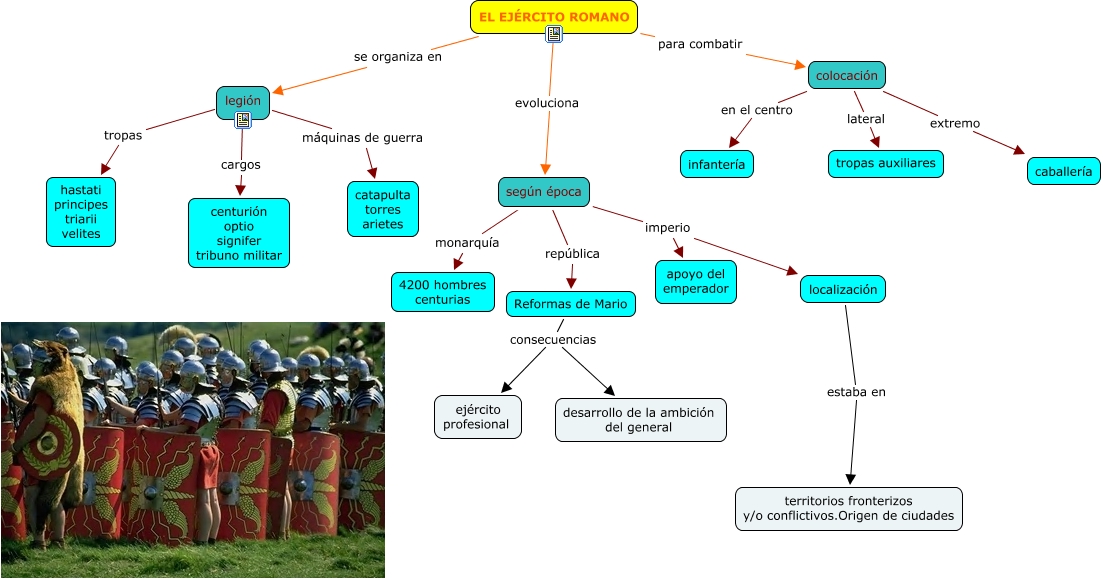 Este Cmap, tiene información relacionada con: el ejército romano, según época imperio apoyo del emperador, legión máquinas de guerra catapulta torres arietes, EL EJÉRCITO ROMANO se organiza en legión, legión tropas hastati principes triarii velites, EL EJÉRCITO ROMANO para combatir colocación, según época monarquía 4200 hombres centurias, colocación lateral tropas auxiliares, colocación extremo caballería, según época república Reformas de Mario, según época imperio localización, localización estaba en territorios fronterizos y/o conflictivos.Origen de ciudades, Reformas de Mario consecuencias desarrollo de la ambición del general, colocación en el centro infantería, legión cargos centurión optio signifer tribuno militar, EL EJÉRCITO ROMANO evoluciona según época, Reformas de Mario consecuencias ejército profesional