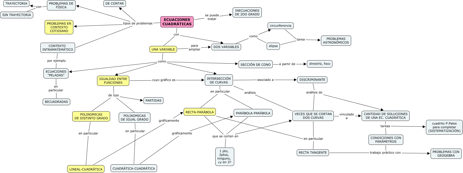 Este Cmap, tiene información relacionada con: ECUACIONES CUADRÁTICAS, DISCRIMINANTE análisis de CANTIDAD DE SOLUCIONES DE UNA EC. CUADRÁTICA, LINEAL-CUADRÁTICA gráficamente RECTA-PARÁBOLA, ECUACIONES CUADRÁTICAS tipos de problemas CONTEXTO INTRAMATEMÁTICO, PARÁBOLA-PARÁBOLA que se corten en 1 pto, 2ptos, ninguno, ¿y en 3?, RECTA TANGENTE trabajo práctico con PROBLEMAS CON GEOGEBRA, elipse tarea PROBLEMAS ASTRONÓMICOS, IGUALDAD ENTRE FUNCIONES de tipo POLINOMICAS DE IGUAL GRADO, ECUACIONES "PELADAS" en particular BICUADRADAS, UNA VARIABLE como IGUALDAD ENTRE FUNCIONES, IGUALDAD ENTRE FUNCIONES cuyo gráfico es INTERSECCIÓN DE CURVAS, UNA VARIABLE para ampliar DOS VARIABLES, POLINOMICAS DE DISTINTO GRADO en particular LINEAL-CUADRÁTICA, POLINOMICAS DE IGUAL GRADO en particular CUADRÁTICA-CUADRÁTICA, UNA VARIABLE como INTERSECCIÓN DE CURVAS, DOS VARIABLES como circunferencia, ECUACIONES CUADRÁTICAS con DOS VARIABLES, CANTIDAD DE SOLUCIONES DE UNA EC. CUADRÁTICA tareas cuadrito P.Palos para completar (SISTEMATIZACIÓN), PROBLEMAS DE FÍSICA con SIN TRAYECTORIA, CONTEXTO INTRAMATEMÁTICO por ejemplo ECUACIONES "PELADAS", ECUACIONES CUADRÁTICAS tipos de problemas DE CONTAR