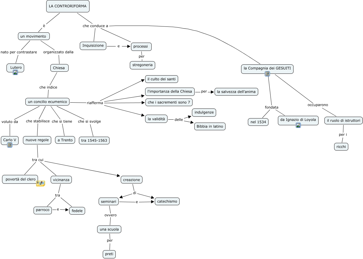 Questa Cmap, creata con IHMC CmapTools, contiene informazioni relative a: Marzolo_Rossini, la Compagnia dei GESUITI occuparono il ruolo di istruttori, seminari e catechismo, LA CONTRORIFORMA che conduce a processi, un movimento nato per contrastare Lutero, parroco e fedele, un concilio ecumenico che si svolge tra 1545-1563, un concilio ecumenico riafferma che i sacrementi sono 7, LA CONTRORIFORMA è un movimento, una scuola per preti, LA CONTRORIFORMA che conduce a la Compagnia dei GESUITI, la Compagnia dei GESUITI fondata nel 1534, nuove regole tra cui vicinanza, la validità delle indulgenze, nuove regole tra cui povertà del clero, il ruolo di istruttori per i ricchi, creazione di catechismo, vicinanza tra fedele, LA CONTRORIFORMA che conduce a Inquisizione, creazione di seminari, un concilio ecumenico riafferma il culto dei santi