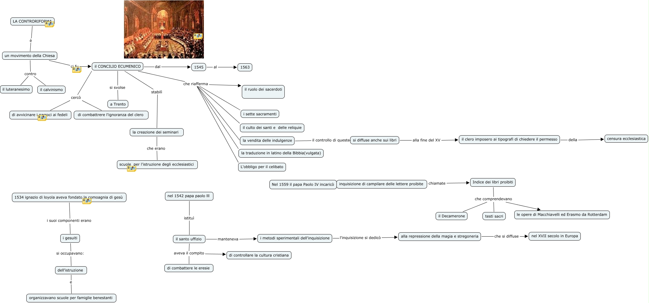 Questa Cmap, creata con IHMC CmapTools, contiene informazioni relative a: Tia Luca e yoss, i metodi sperimentali dell'inquisizione l'inquisizione si dedicò alla repressione della magia e stregoneria, il CONCILIO ECUMENICO dal 1545, 1534 ignazio di loyola aveva fondato la comoagnia di gesù i suoi componenti erano i gesuiti, il CONCILIO ECUMENICO che riafferma la vendita delle indulgenze, il CONCILIO ECUMENICO che riafferma il culto dei santi e delle reliquie, il CONCILIO ECUMENICO che riafferma i sette sacramenti, Indice dei libri proibiti che comprendevano le opere di Macchiavelli ed Erasmo da Rotterdam, il santo uffizio aveva il compito di controllare la cultura cristiana, i gesuiti si occupavano: dell'istruzione, LA CONTRORIFORMA è un movimento della Chiesa, alla repressione della magia e stregoneria che si diffuse nel XVII secolo in Europa, Nel 1559 il papa Paolo IV incaricò all' inquisizione di campilare delle lettere proibite, il CONCILIO ECUMENICO che riafferma il ruolo dei sacerdoti, si diffuse anche sui libri alla fine del XV il clero imposero ai tipografi di chiedere il permesso, Indice dei libri proibiti che comprendevano il Decamerone, inquisizione di campilare delle lettere proibite chiamate Indice dei libri proibiti, nel 1542 papa paolo lll istituì il santo uffizio, il CONCILIO ECUMENICO che riafferma L'obbligo per il celibato, il CONCILIO ECUMENICO cercò di avvicinare i parroci ai fedeli, 1545 al 1563