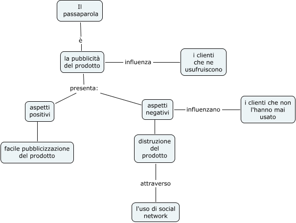Questa Cmap, creata con IHMC CmapTools, contiene informazioni relative a: il passaparola, aspetti positivi ???? facile pubblicizzazione del prodotto, la pubblicità del prodotto influenza i clienti che ne usufruiscono, aspetti negativi influenzano i clienti che non l'hanno mai usato, la pubblicità del prodotto presenta: aspetti negativi, aspetti negativi sono distruzione del prodotto, la pubblicità del prodotto presenta: aspetti positivi, Il passaparola è la pubblicità del prodotto, distruzione del prodotto attraverso l'uso di social network