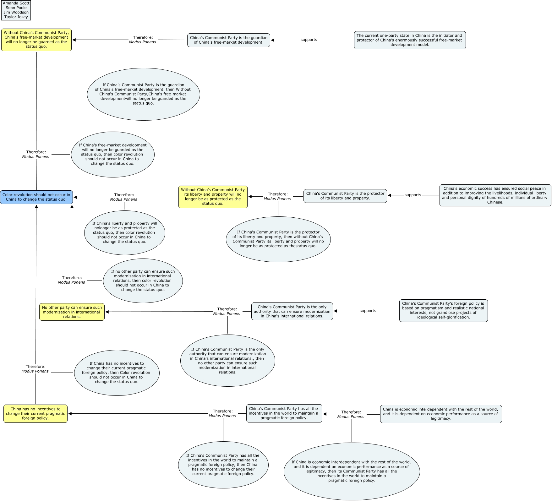 This Concept Map, created with IHMC CmapTools, has information related to: Color Change Should not Occur in China, China's Communist Party is the guardian of China's free-market development. Therefore: Modus Ponens If China's Communist Party is the guardian of China's free-market development, then Without China's Communist Party,China's free-market developmentwill no longer be guarded as the status quo., If no other party can ensure such modernization in international relations, then color revolution should not occur in China to change the status quo. Therefore: Modus Ponens Color revolution should not occur in China to change the status quo., No other party can ensure such modernization in international relations. Therefore: Modus Ponens Color revolution should not occur in China to change the status quo., Without China's Communist Party, China's free-market development will no longer be guarded as the status quo. Therefore: Modus Ponens Color revolution should not occur in China to change the status quo., If China is economic interdependent with the rest of the world, and it is dependent on economic performance as a source of legitimacy, then its Communist Party has all the incentives in the world to maintain a pragmatic foreign policy. Therefore: Modus Ponens China's Communist Party has all the incentives in the world to maintain a pragmatic foreign policy., If China has no incentives to change their current pragmatic foreign policy, then Color revolution should not occur in China to change the status quo. Therefore: Modus Ponens Color revolution should not occur in China to change the status quo., China’s economic success has ensured social peace in addition to improving the livelihoods, individual liberty and personal dignity of hundreds of millions of ordinary Chinese. supports China's Communist Party is the protector of its liberty and property., The current one-party state in China is the initiator and protector of China’s enormously successful free-market development model. supports China's Communist Party is the guardian of China's free-market development., China is economic interdependent with the rest of the world, and it is dependent on economic performance as a source of legitimacy. Therefore: Modus Ponens China's Communist Party has all the incentives in the world to maintain a pragmatic foreign policy., China's Communist Party is the only authority that can ensure modernization in China's international relations. Therefore: Modus Ponens No other party can ensure such modernization in international relations., If China's Communist Party is the only authority that can ensure modernization in China's international relations., then no other party can ensure such modernization in international relations. Therefore: Modus Ponens No other party can ensure such modernization in international relations., China's Communist Party is the protector of its liberty and property. Therefore: Modus Ponens Without China's Communist Party its liberty and property will no longer be as protected as the status quo., If China's free-market development will no longer be guarded as the status quo, then color revolution should not occur in China to change the status quo. Therefore: Modus Ponens Color revolution should not occur in China to change the status quo., China has no incentives to change their current pragmatic foreign policy. Therefore: Modus Ponens Color revolution should not occur in China to change the status quo., China's Communist Party has all the incentives in the world to maintain a pragmatic foreign policy. Therefore: Modus Ponens China has no incentives to change their current pragmatic foreign policy., If China's Communist Party has all the incentives in the world to maintain a pragmatic foreign policy, then China has no incentives to change their current pragmatic foreign policy. Therefore: Modus Ponens China has no incentives to change their current pragmatic foreign policy., China's Communist Party's foreign policy is based on pragmatism and realistic national interests, not grandiose projects of ideological self-glorification. supports China's Communist Party is the only authority that can ensure modernization in China's international relations., China's Communist Party is the guardian of China's free-market development. Therefore: Modus Ponens Without China's Communist Party, China's free-market development will no longer be guarded as the status quo., If China's liberty and property will nolonger be as protected as the status quo, then color revolution should not occur in China to change the status quo. Therefore: Modus Ponens Color revolution should not occur in China to change the status quo., If China's Communist Party is the protector of its liberty and property, then without China's Communist Party its liberty and property will no longer be as protected as thestatus quo. Therefore: Modus Ponens Without China's Communist Party its liberty and property will no longer be as protected as the status quo.