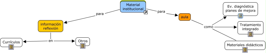 This Concept Map, created with IHMC CmapTools, has information related to: Material institucional, aula como Materiales didácticos, información reflexión en Otros, aula como Tratamiento integrado, Material institucional para información reflexión, Material institucional para aula, información reflexión en Currículos, aula como Ev. diagnóstica planes de mejora