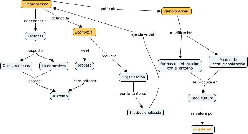 Este Cmap, tiene información relacionada con: Sustantivismo, Sustantivismo se entiende cambio social, Economía requiere Organización, Pautas de institucionalización se produce en Cada cultura, cambio social modificación formas de interacción con el entorno, Cada cultura se valora por lo que es, Personas respecto Otras personas, Institucionalizada eje clave del Sustantivismo, cambio social modificación Pautas de institucionalización, Economía es el proceso, formas de interacción con el entorno se produce en Cada cultura, proceso para obtener sustento, La naturaleza obtener sustento, Otras personas obtener sustento, Personas respecto La naturaleza, Sustantivismo dependencia Personas, Organización por lo tanto es Institucionalizada, Sustantivismo definde la Economía