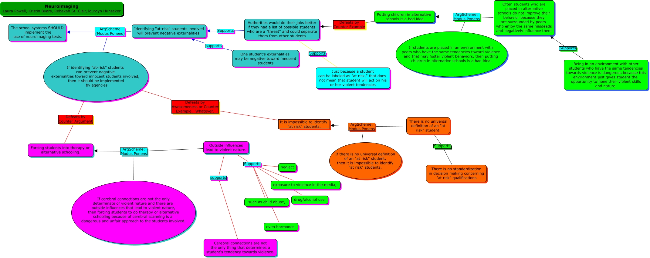 This Concept Map, created with IHMC CmapTools, has information related to: CMAP3, exposure to violence in the media, Supports Outside influences lead to violent nature., It is impossible to identify "at risk" students. Defeats by Awesomeness or Counter Example. Whatever. If identifying "at-risk" students can prevent negative externalities toward innocent students involved, then it should be implemented by agencies, If there is no universal definition of an "at risk" student, then it is impossible to identify "at risk" students. ArgScheme: Modus Ponens It is impossible to identify "at risk" students., Being in an environment with other students who have the same tendencies towards violence is dangerous because this environment just gives student the opportunity to hone their violent skills and nature. Supports Often students who are placed in alternative schools do not improve their behavior because they are surrounded by peers who enjoy the same misdeeds and negatively influence them, There is no standardization in decision making concerning "at risk" qualifications Supports There is no universal definition of an "at risk" student., Often students who are placed in alternative schools do not improve their behavior because they are surrounded by peers who enjoy the same misdeeds and negatively influence them ArgScheme: Modus Ponens Putting children in alternative schools is a bad idea, If identifying "at-risk" students can prevent negative externalities toward innocent students involved, then it should be implemented by agencies ArgScheme (Modus Ponens) The school systems SHOULD implement the use of neuroimaging tests., Forcing students into therapy or alternative schooling. Defeats by Counter Argument If identifying "at-risk" students can prevent negative externalities toward innocent students involved, then it should be implemented by agencies, Putting children in alternative schools is a bad idea Defeats by Counter Example Authorities would do their jobs better if they had a list of possible students who are a "threat" and could separate them from other students, There is no universal definition of an "at risk" student. ArgScheme: Modus Ponens It is impossible to identify "at risk" students., If students are placed in an environment with peers who have the same tendencies toward violence and that may foster violent behaviors, then putting children in alternative schools is a bad idea. ArgScheme: Modus Ponens Putting children in alternative schools is a bad idea, neglect Supports Outside influences lead to violent nature., If cerebral connections are not the only determinate of violent nature and there are outside influences that lead to violent nature, then forcing students to do therapy or alternative schooling because of cerebral scanning is a dangerous and unfair approach to the students involved. ArgScheme: Modus Ponens Forcing students into therapy or alternative schooling., Authorities would do their jobs better if they had a list of possible students who are a "threat" and could separate them from other students Supports Identifying "at-risk" students involved will prevent negative externalities., even hormones Supports Outside influences lead to violent nature., drug/alcohol use Supports Outside influences lead to violent nature., Just because a student can be labeled as "at risk," that does not mean that student will act on his or her violent tendencies Supports Authorities would do their jobs better if they had a list of possible students who are a "threat" and could separate them from other students, Identifying "at-risk" students involved will prevent negative externalities. ArgScheme (Modus Ponens) The school systems SHOULD implement the use of neuroimaging tests., such as child abuse, Supports Outside influences lead to violent nature., Cerebral connections are not the only thing that determines a student's tendency towards violence. supports Outside influences lead to violent nature.
