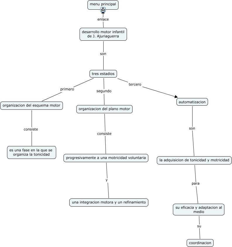 Este Cmap, tiene información relacionada con: primer mapa, tres estadios segundo organizacion del plano motor, organizacion del plano motor consiste progresivamente a una motricidad voluntaria, su eficacia y adaptacion al medio su coordinacion, progresivamente a una motricidad voluntaria y una integracion motora y un refinamiento, organizacion del esquema motor consiste es una fase en la que se organiza la tonicidad, desarrollo motor infantil de J. Ajuriaguerra son tres estadios, desarrollo motor infantil de J. Ajuriaguerra enlace menu principal, tres estadios primero organizacion del esquema motor, la adquisicion de tonicidad y motricidad para su eficacia y adaptacion al medio, automatizacion son la adquisicion de tonicidad y motricidad, tres estadios tercero automatizacion
