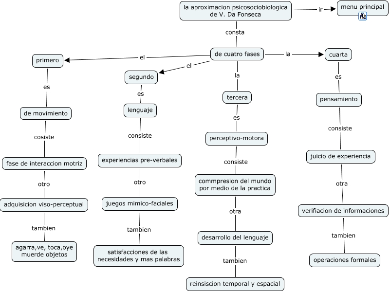 Este Cmap, tiene información relacionada con: quinto mapa, de cuatro fases el primero, de cuatro fases la cuarta, la aproximacion psicosociobiologica de V. Da Fonseca consta de cuatro fases, juicio de experiencia otra verifiacion de informaciones, perceptivo-motora consiste commpresion del mundo por medio de la practica, experiencias pre-verbales otro juegos mimico-faciales, lenguaje consiste experiencias pre-verbales, de cuatro fases el segundo, cuarta es pensamiento, la aproximacion psicosociobiologica de V. Da Fonseca ir menu principal, verifiacion de informaciones tambien operaciones formales, tercera es perceptivo-motora, pensamiento consiste juicio de experiencia, primero es de movimiento, juegos mimico-faciales tambien satisfacciones de las necesidades y mas palabras, de movimiento cosiste fase de interaccion motriz, segundo es lenguaje, de cuatro fases la tercera, fase de interaccion motriz otro adquisicion viso-perceptual, desarrollo del lenguaje tambien reinsiscion temporal y espacial