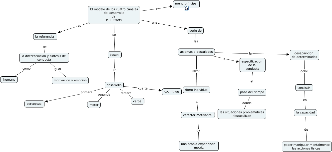 Este Cmap, tiene información relacionada con: septimo mapa, especificacion de la conducta el paso del tiempo, axiomas o postulados como ritmo individual, paso del tiempo donde las situaciones problematicas obstaculizan, El modelo de los cuatro canales del desarrollo de B.J. Cratty ir menu principal, la referencia de la diferenciacion y sintesis de conducta, desarrollo cuarta cognitivas, la diferenciacion y sintesis de conducta como humana, la capacidad de poder manipular mentalmente las acciones fisicas, la diferenciacion y sintesis de conducta igual motivacion y emocion, serie de las axiomas o postulados, axiomas o postulados la desaparicion de determinadas, El modelo de los cuatro canales del desarrollo de B.J. Cratty se basan, desarrollo segunda motor, basan en desarrollo, ritmo individual el caracter motivante, caracter motivante de una propia experiencia motriz, El modelo de los cuatro canales del desarrollo de B.J. Cratty es la referencia, desaparicion de determinadas debe consistir, axiomas o postulados la especificacion de la conducta, consistir en la capacidad
