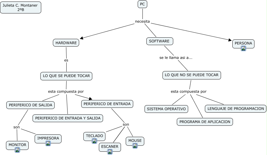 Este Cmap, tiene información relacionada con: Montaner Hard y Soft, LO QUE NO SE PUEDE TOCAR esta compuesta por SISTEMA OPERATIVO, PERIFERICO DE ENTRADA son TECLADO, ESCANER son TECLADO, PC necesita HARDWARE, LO QUE SE PUEDE TOCAR esta compuesta por PERIFERICO DE ENTRADA, LO QUE SE PUEDE TOCAR esta compuesta por PERIFERICO DE ENTRADA Y SALIDA, PERIFERICO DE SALIDA son IMPRESORA, PERIFERICO DE SALIDA son MONITOR, LO QUE SE PUEDE TOCAR esta compuesta por PERIFERICO DE SALIDA, SOFTWARE se le llama asi a... LO QUE NO SE PUEDE TOCAR, PERIFERICO DE ENTRADA son ESCANER, PERIFERICO DE ENTRADA son MOUSE, PC necesita PERSONA, HARDWARE es LO QUE SE PUEDE TOCAR, ESCANER son MOUSE, PC necesita SOFTWARE, LO QUE NO SE PUEDE TOCAR esta compuesta por PROGRAMA DE APLICACION, LO QUE NO SE PUEDE TOCAR esta compuesta por LENGUAJE DE PROGRAMACION