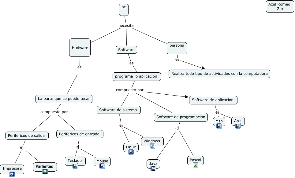 Este Cmap, tiene información relacionada con: romeo Hard y soft, Hadware es La parte que se puede tocar, Perifericos de salida ej Parlantes, Software de programacion ej Pascal, Perifericos de entrada ej Mouse, Perifericos de entrada ej Teclado, persona es Realiza todo tipo de actividades con la computadora, Software de sistema ej Windows, pc necesita Software, La parte que se puede tocar compuesto por Perifericos de entrada, La parte que se puede tocar compuesto por Perifericos de salida, pc necesita persona, Perifericos de salida ej Impresora, programa o aplicacion compuesto por Software de sistema, Software de aplicacion ej Msn, pc necesita Hadware, programa o aplicacion compuesto por Software de programacion, Software de sistema ej Linux, programa o aplicacion compuesto por Software de aplicacion, Software de aplicacion ej Ares, Software es programa o aplicacion