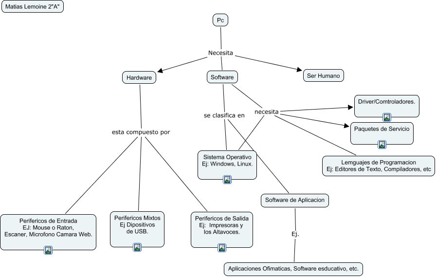 Este Cmap, tiene información relacionada con: Matias Lemoine Hardware y Software, Software se clasifica en Software de Aplicacion, Software necesita Driver/Comtroladores., Software necesita Sistema Operativo Ej: Windows, Linux., Software necesita Lemguajes de Programacion Ej: Editores de Texto, Compiladores, etc, Hardware esta compuesto por Perifericos Mixtos Ej Dipositivos de USB., Pc Necesita Software, Software necesita Paquetes de Servicio, Hardware esta compuesto por Perifericos de Entrada EJ: Mouse o Raton, Escaner, Microfono Camara Web., Software se clasifica en Sistema Operativo Ej: Windows, Linux., Software de Aplicacion Ej. Aplicaciones Ofimaticas, Software esducativo, etc., Pc Necesita Ser Humano, Pc Necesita Hardware, Hardware esta compuesto por Perifericos de Salida Ej: Impresoras y los Altavoces.