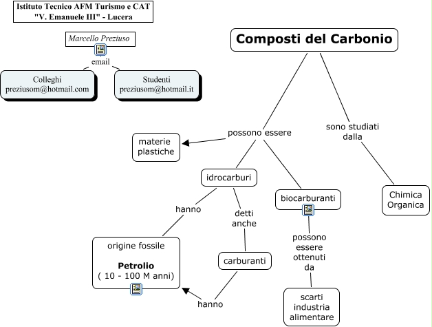 Questa Cmap, creata con IHMC CmapTools, contiene informazioni relative a: Composti del Carbonio 2, Marcello Preziuso email Colleghi preziusom@hotmail.com, Composti del Carbonio possono essere idrocarburi, Composti del Carbonio possono essere biocarburanti, Composti del Carbonio possono essere materie plastiche, carburanti hanno origine fossile Petrolio ( 10 - 100 M anni), biocarburanti possono essere ottenuti da scarti industria alimentare, Composti del Carbonio sono studiati dalla Chimica Organica, idrocarburi hanno origine fossile Petrolio ( 10 - 100 M anni), idrocarburi detti anche carburanti, Marcello Preziuso email Studenti preziusom@hotmail.it
