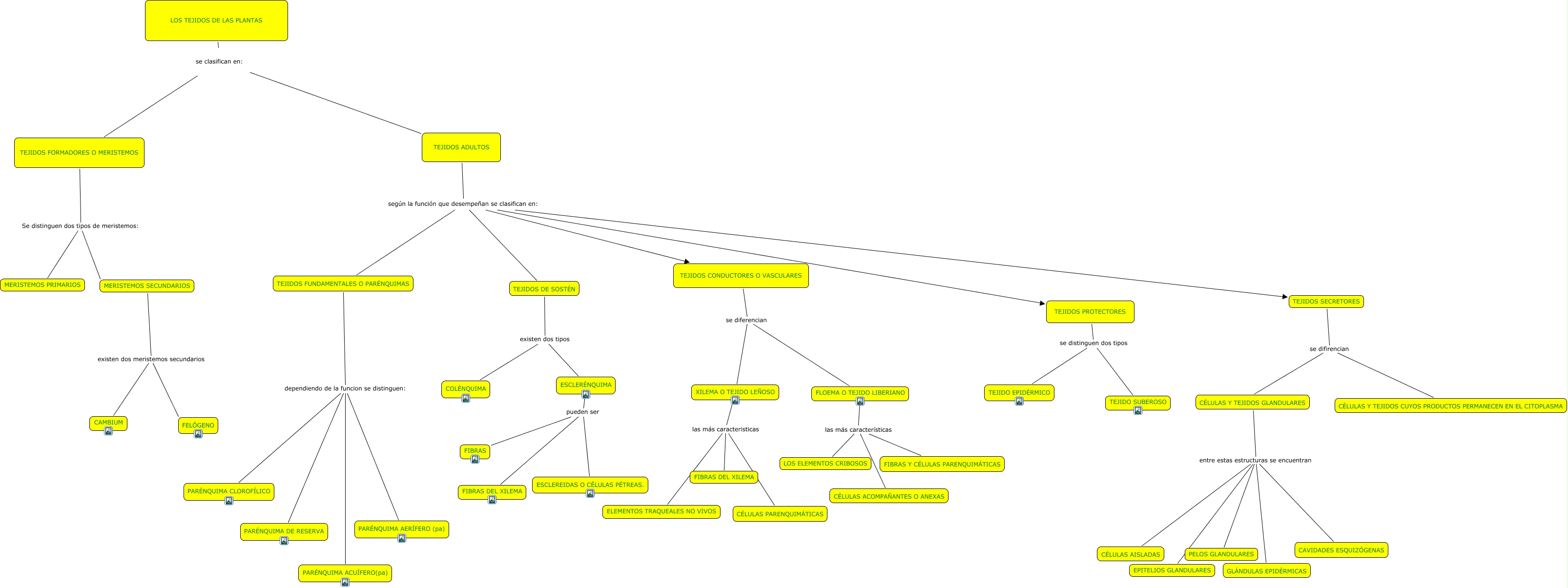 Este Cmap, tiene información relacionada con: los tejidos de las plantas, TEJIDOS SECRETORES se difirencian CÉLULAS Y TEJIDOS CUYOS PRODUCTOS PERMANECEN EN EL CITOPLASMA, TEJIDOS SECRETORES se difirencian CÉLULAS Y TEJIDOS GLANDULARES, TEJIDOS FORMADORES O MERISTEMOS Se distinguen dos tipos de meristemos: MERISTEMOS PRIMARIOS, TEJIDOS FUNDAMENTALES O PARÉNQUIMAS dependiendo de la funcion se distinguen: PARÉNQUIMA AERÍFERO (pa), FLOEMA O TEJIDO LIBERIANO las más características CÉLULAS ACOMPAÑANTES O ANEXAS, ESCLERÉNQUIMA pueden ser FIBRAS, TEJIDOS ADULTOS según la función que desempeñan se clasifican en: TEJIDOS DE SOSTÉN, ESCLERÉNQUIMA pueden ser ESCLEREIDAS O CÉLULAS PÉTREAS., TEJIDOS FUNDAMENTALES O PARÉNQUIMAS dependiendo de la funcion se distinguen: PARÉNQUIMA ACUÍFERO(pa), TEJIDOS ADULTOS según la función que desempeñan se clasifican en: TEJIDOS SECRETORES, TEJIDOS ADULTOS según la función que desempeñan se clasifican en: TEJIDOS FUNDAMENTALES O PARÉNQUIMAS, MERISTEMOS SECUNDARIOS existen dos meristemos secundarios CAMBIUM, MERISTEMOS SECUNDARIOS existen dos meristemos secundarios FELÓGENO, XILEMA O TEJIDO LEÑOSO las más caracteristicas CÉLULAS PARENQUIMÁTICAS, ESCLERÉNQUIMA pueden ser FIBRAS DEL XILEMA, TEJIDOS ADULTOS según la función que desempeñan se clasifican en: TEJIDOS PROTECTORES, CÉLULAS Y TEJIDOS GLANDULARES entre estas estructuras se encuentran CAVIDADES ESQUIZÓGENAS, XILEMA O TEJIDO LEÑOSO las más caracteristicas ELEMENTOS TRAQUEALES NO VIVOS, TEJIDOS DE SOSTÉN existen dos tipos ESCLERÉNQUIMA, CÉLULAS Y TEJIDOS GLANDULARES entre estas estructuras se encuentran CÉLULAS AISLADAS