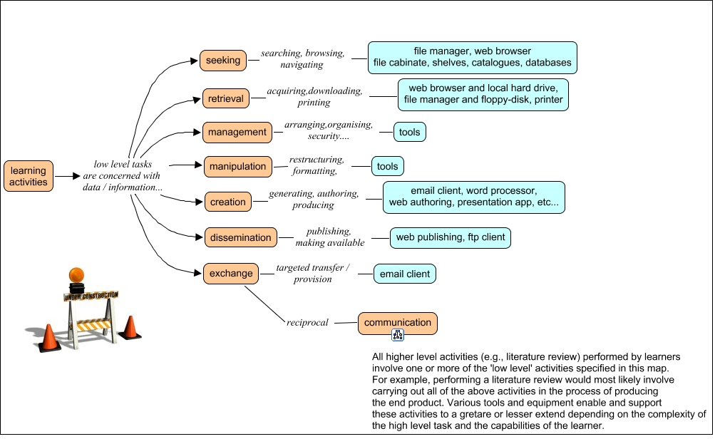 This Concept Map, created with IHMC CmapTools, has information related to: Activity - Learning - low level, learning activities low level tasks are concerned with data / information... exchange, dissemination publishing, making available web publishing, ftp client, management arranging,organising, security.... tools, learning activities low level tasks are concerned with data / information... dissemination, learning activities low level tasks are concerned with data / information... exchange, learning activities low level tasks are concerned with data / information... retrieval, learning activities low level tasks are concerned with data / information... seeking, learning activities low level tasks are concerned with data / information... management, seeking searching, browsing, navigating file manager, web browser file cabinate, shelves, catalogues, databases, learning activities low level tasks are concerned with data / information... seeking, creation generating, authoring, producing email client, word processor, web authoring, presentation app, etc..., exchange targeted transfer / provision email client, learning activities low level tasks are concerned with data / information... dissemination, learning activities low level tasks are concerned with data / information... manipulation, manipulation restructuring, formatting, tools, learning activities low level tasks are concerned with data / information... manipulation, learning activities low level tasks are concerned with data / information... retrieval, learning activities low level tasks are concerned with data / information... creation, learning activities low level tasks are concerned with data / information... management, retrieval acquiring,downloading, printing web browser and local hard drive, file manager and floppy-disk, printer