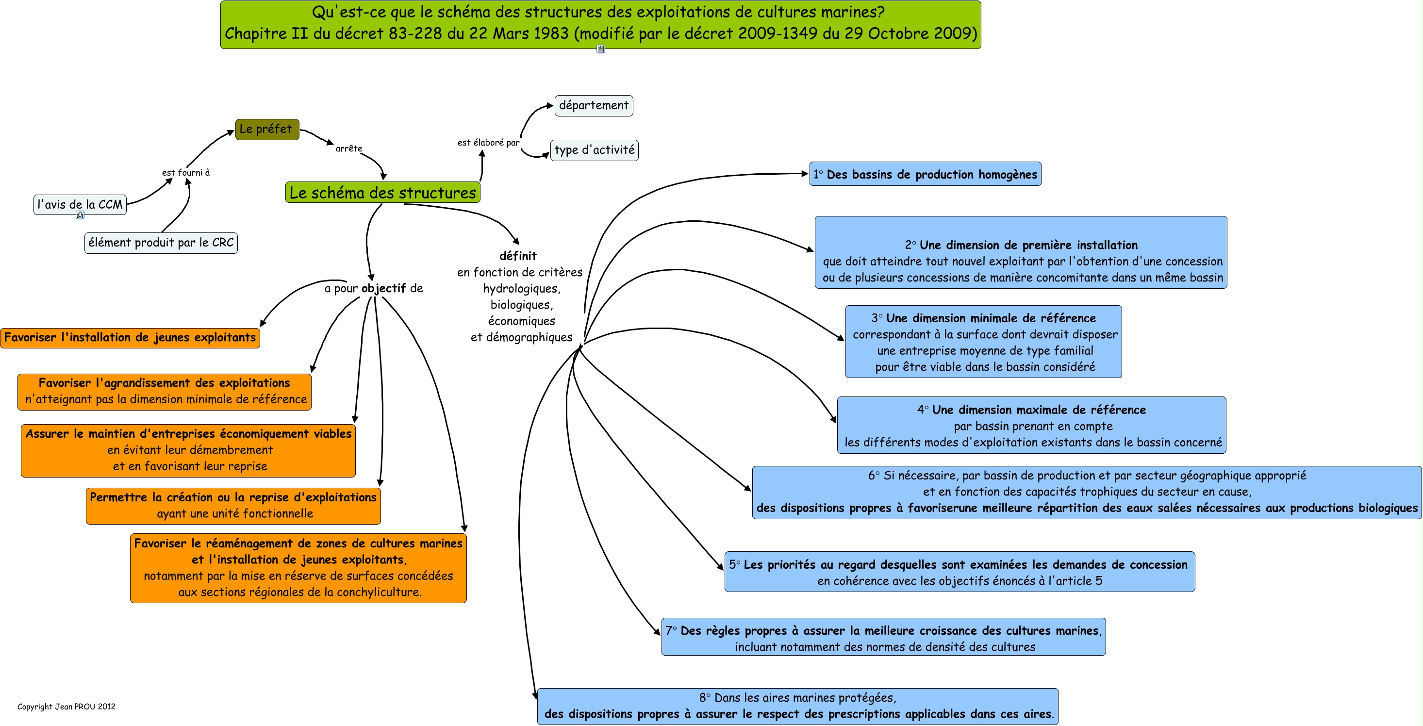 Cette carte de concepts créée avec IHMC CmapTools traite de: Schéma des structures des exploitations de cultures marines, Le schéma des structures a pour objectif de Permettre la création ou la reprise d'exploitations ayant une unité fonctionnelle, Le schéma des structures définit en fonction de critères hydrologiques, biologiques, économiques et démographiques 2° Une dimension de première installation que doit atteindre tout nouvel exploitant par l'obtention d'une concession ou de plusieurs concessions de manière concomitante dans un même bassin, Le schéma des structures définit en fonction de critères hydrologiques, biologiques, économiques et démographiques 7° Des règles propres à assurer la meilleure croissance des cultures marines, incluant notamment des normes de densité des cultures, Le schéma des structures définit en fonction de critères hydrologiques, biologiques, économiques et démographiques 8° Dans les aires marines protégées, des dispositions propres à assurer le respect des prescriptions applicables dans ces aires., Le schéma des structures définit en fonction de critères hydrologiques, biologiques, économiques et démographiques 1° Des bassins de production homogènes, Le schéma des structures est élaboré par département, Le schéma des structures a pour objectif de Favoriser le réaménagement de zones de cultures marines et l'installation de jeunes exploitants, notamment par la mise en réserve de surfaces concédées aux sections régionales de la conchyliculture., Le schéma des structures définit en fonction de critères hydrologiques, biologiques, économiques et démographiques 5° Les priorités au regard desquelles sont examinées les demandes de concession en cohérence avec les objectifs énoncés à l'article 5, Le schéma des structures définit en fonction de critères hydrologiques, biologiques, économiques et démographiques 3° Une dimension minimale de référence correspondant à la surface dont devrait disposer une entreprise moyenne de type familial pour être viable dans le bassin considéré, Le préfet arrête Le schéma des structures, Le schéma des structures définit en fonction de critères hydrologiques, biologiques, économiques et démographiques 6° Si nécessaire, par bassin de production et par secteur géographique approprié et en fonction des capacités trophiques du secteur en cause, des dispositions propres à favoriserune meilleure répartition des eaux salées nécessaires aux productions biologiques, élément produit par le CRC est fourni à Le préfet, Le schéma des structures définit en fonction de critères hydrologiques, biologiques, économiques et démographiques 4° Une dimension maximale de référence par bassin prenant en compte les différents modes d'exploitation existants dans le bassin concerné, Le schéma des structures a pour objectif de Assurer le maintien d'entreprises économiquement viables en évitant leur démembrement et en favorisant leur reprise, Le schéma des structures est élaboré par type d'activité, Le schéma des structures a pour objectif de Favoriser l'agrandissement des exploitations n'atteignant pas la dimension minimale de référence, l'avis de la CCM est fourni à Le préfet, Le schéma des structures a pour objectif de Favoriser l'installation de jeunes exploitants