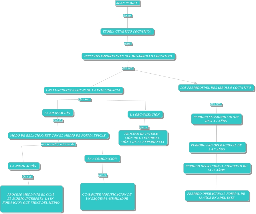 Questa Cmap, creata con IHMC CmapTools, contiene informazioni relative a: MAPA CONCEPTUAL DE LA TEORIA COGNITIVA, JEAN PIAGET En su TEORIA GENETICO COGNITIVA, LA ADAPTACIÓN que es MODO DE RELACIONARSE CON EL MEDIO DE FORMA EFICAZ, TEORIA GENETICO COGNITIVA trata ASPECTOS IMPORTANTES DEL DESARROLLO COGNITIVO, LOS PERIODOSDEL DESARROLLO COGNITIVO que son PERIODO PRE-OPERACIONAL DE 2 A 7 AÑOS, MODO DE RELACIONARSE CON EL MEDIO DE FORMA EFICAZ que se realiza a través de LA ACOMODACIÓN, ASPECTOS IMPORTANTES DEL DESARROLLO COGNITIVO que son LAS FUNCIONES BASICAS DE LA INTELIGENCIA, LOS PERIODOSDEL DESARROLLO COGNITIVO que son PERIODO OPERACIONAL CONCRETO DE 7A 12 AÑOS, LOS PERIODOSDEL DESARROLLO COGNITIVO que son PERIODO OPERACIONAL FORMAL DE 12 AÑOS EN ADELANTE, MODO DE RELACIONARSE CON EL MEDIO DE FORMA EFICAZ que se realiza a través de LA ASIMILACIÓN, ASPECTOS IMPORTANTES DEL DESARROLLO COGNITIVO que son LOS PERIODOSDEL DESARROLLO COGNITIVO, LA ASIMILACIÓN Que es PROCESO MEDIANTE EL CUAL EL SUJETO INTREPETA LA IN- FORMACIÓN QUE VIENE DEL MEDIO, LAS FUNCIONES BASICAS DE LA INTELIGENCIA Que son LA ORGANIZACIÓN, LOS PERIODOSDEL DESARROLLO COGNITIVO que son PERIODO SENSIORIO MOTOR DE 0 A 2 AÑOS, LAS FUNCIONES BASICAS DE LA INTELIGENCIA Que son LA ADAPTACIÓN, LA ACOMODACIÓN Que es CUALQUIER MODIFICACIÓN DE UN ESQUEMA ASIMILADOR, LA ORGANIZACIÓN Que es PROCESO DE INTERAC- CIÓN DE LA INFORMA- CIÓN Y DE LA EXPERIENCIA