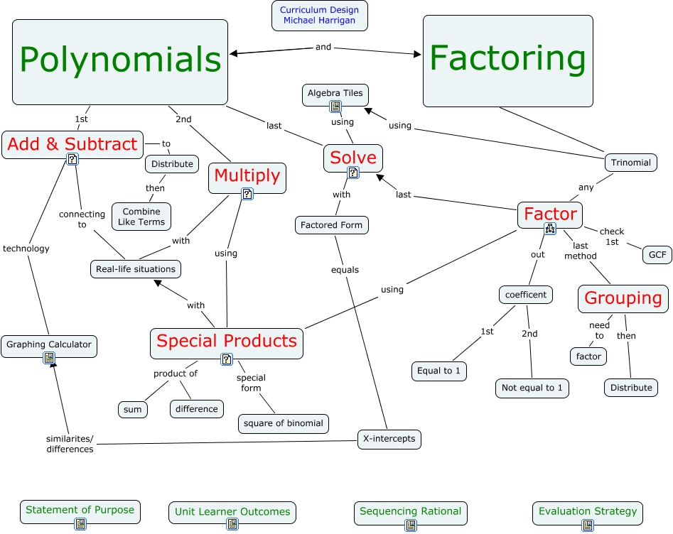 This Concept Map, created with IHMC CmapTools, has information related to: Mike Harrigancurriculumdesign, Add & Subtract to Distribute, Factor out coefficent, Special Products special form square of binomial, Factoring ???? Trinomial, Solve with Factored Form, Add & Subtract technology Graphing Calculator, Multiply using Special Products, Polynomials last Solve, Factored Form equals X-intercepts, Factor last Solve, Multiply with Real-life situations, Factor check 1st GCF, Factor using Special Products, Trinomial any Factor, Special Products product of difference, Special Products product of sum, Distribute then Combine Like Terms, coefficent 2nd Not equal to 1, Grouping then Distribute, Algebra Tiles using Solve