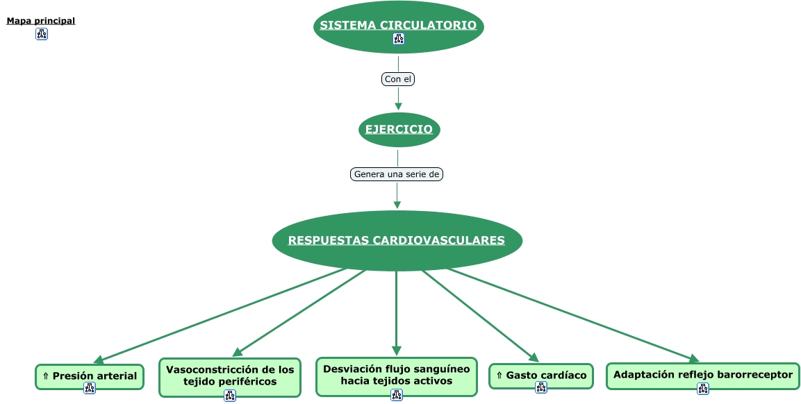 Este Cmap, tiene información relacionada con: RESPUESTAS CARDIOVASCULARES AL EJERCICIO, RESPUESTAS CARDIOVASCULARES ???? ⇑ Presión arterial, SISTEMA CIRCULATORIO Con el EJERCICIO, RESPUESTAS CARDIOVASCULARES ???? ⇑ Gasto cardíaco, RESPUESTAS CARDIOVASCULARES ???? Vasoconstricción de los tejido periféricos, EJERCICIO Genera una serie de RESPUESTAS CARDIOVASCULARES, RESPUESTAS CARDIOVASCULARES ???? Desviación flujo sanguíneo hacia tejidos activos, RESPUESTAS CARDIOVASCULARES ???? Adaptación reflejo barorreceptor