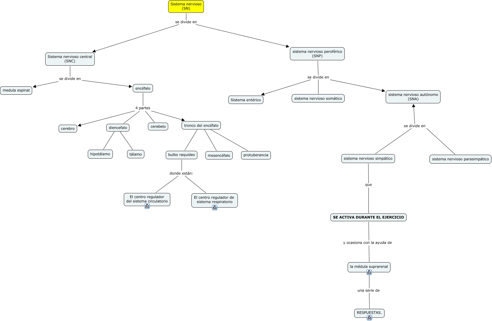 Este Cmap, tiene información relacionada con: SN, SE ACTIVA DURANTE EL EJERCICIO y ocasiona con la ayuda de la médula suprarenal, bulbo raquideo donde están: El centro regulador del sistema circulatorio, encéfalo 4 partes cerebelo, encéfalo 4 partes tronco del encéfalo, Sistema nervioso central (SNC) se divide en encéfalo, bulbo raquideo donde están: El centro regulador de sistema respiratorio, Sistema nervioso (SN) se divide en sistema nervioso peroférico (SNP), tronco del encéfalo ???? protuberancia, Sistema nervioso (SN) se divide en Sistema nervioso central (SNC), encéfalo 4 partes cerebro, sistema nervioso peroférico (SNP) se divide en sistema nervioso autónomo (SNA), diencefalo ???? tálamo, sistema nervioso parasimpático se divide en sistema nervioso autónomo (SNA), diencefalo ???? hipotálamo, la médula suprarenal una serie de RESPUESTAS., tronco del encéfalo ???? mesencéfalo, sistema nervioso peroférico (SNP) se divide en Sistema entérico, sistema nervioso simpático se divide en sistema nervioso autónomo (SNA), tronco del encéfalo ???? bulbo raquideo, encéfalo 4 partes diencefalo