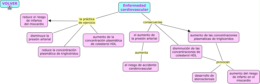 Este Cmap, tiene información relacionada con: enfermedades cardiovasculares, Enfermedad cardiovascular consecuecias el aumento de la presión arterial, disminución de las concentraciones de colesterol HDL provocan desarrollo de aterosclerosis, Enfermedad cardiovascular consecuecias disminución de las concentraciones de colesterol HDL, Enfermedad cardiovascular la práctica de ejercicio reduce la concentración plasmática de triglicéridos, Enfermedad cardiovascular la práctica de ejercicio disminuye la presión arterial, Enfermedad cardiovascular consecuecias aumento de las concentraciones plasmaticas de trigliceridos, aumento de las concentraciones plasmaticas de trigliceridos provocan desarrollo de aterosclerosis, disminución de las concentraciones de colesterol HDL provocan aumento del riesgo de infarto en el miocardio, Enfermedad cardiovascular la práctica de ejercicio reduce el riesgo de infartos del miocardio, aumento de las concentraciones plasmaticas de trigliceridos provocan aumento del riesgo de infarto en el miocardio, Enfermedad cardiovascular la práctica de ejercicio aumento de la concentración plasmática de colesterol HDL, el aumento de la presión arterial aumenta el riesgo de accidente cerebrovascular